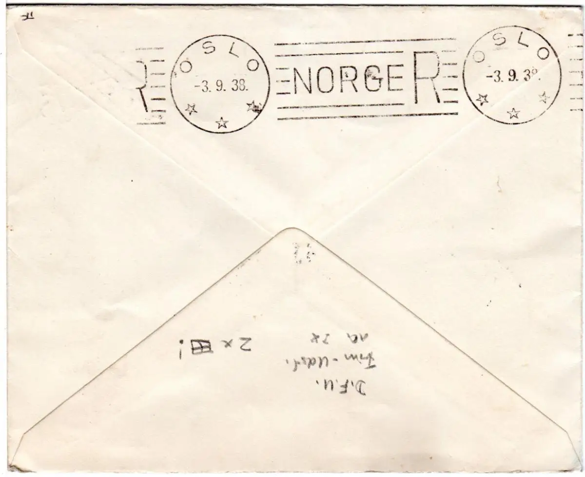 Dänemark 1938, 5 öre DFU Frim. Uttst., 2 Viererblöcke auf Reko FDC n. Norwegen