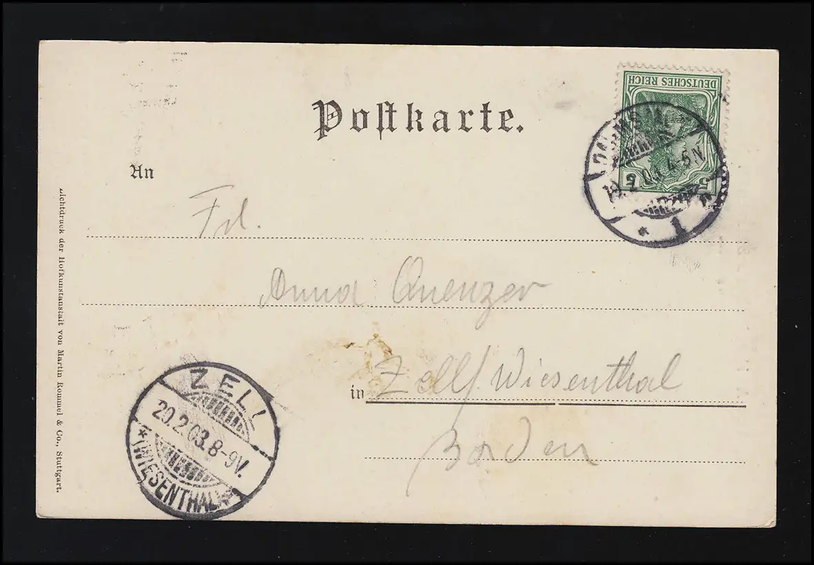 Impression lumineuse de la Cour Kunstanstalt de Martin Rommel & Co, Stuttgart, Verlag v. M. Hendschel, Francfort a.M. Motivation: Discussion entre père et fils qui lui avoue son amour pour une fille. Dessins et versets d'Albert Henschel. Carte passée de Darmstadt à Zell (Wiesenthal) 19. + 20.0.1903. Examen: original Référence de l'article: 00000000036713