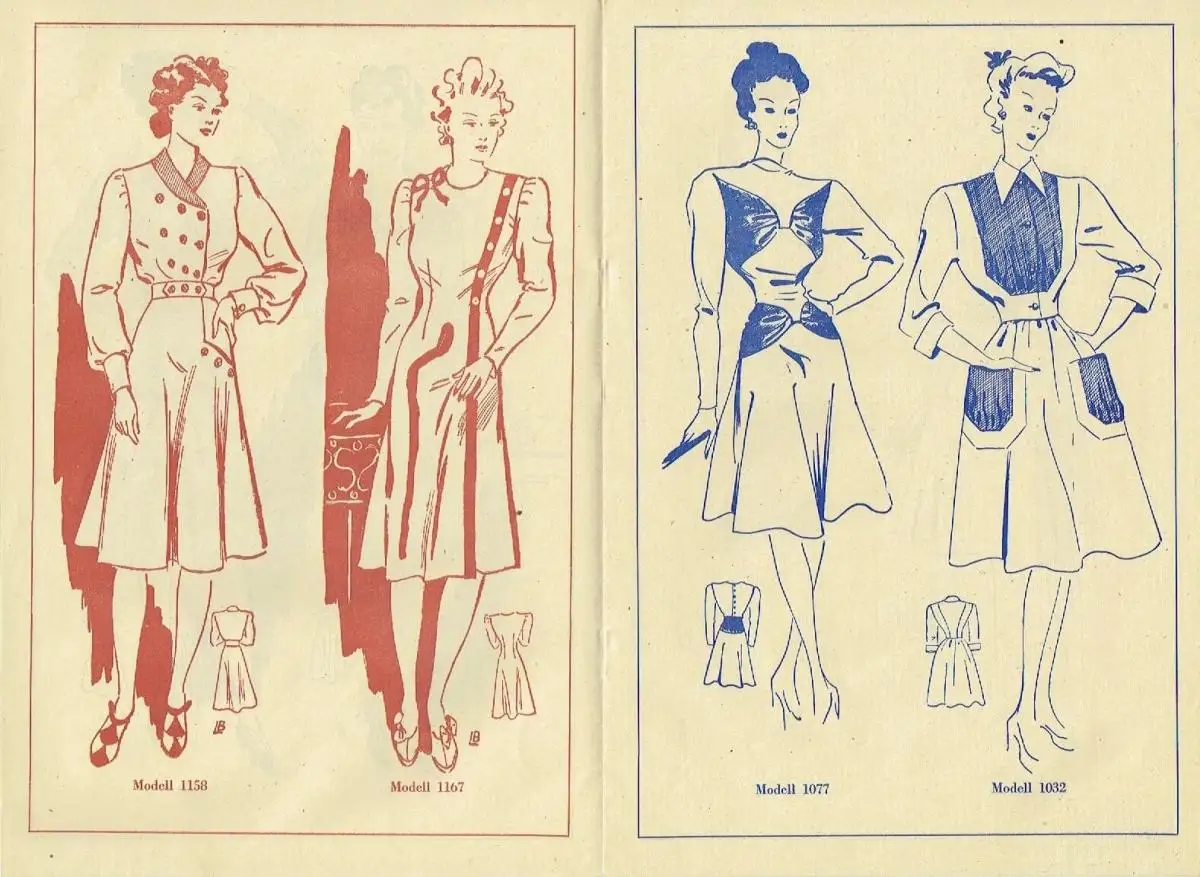 sehr guter Zustand, geringe Gebrauchs- und Alterungsspuren, Modellzeichnungen, keine Schnittmuster!! Damen-Kleider, Modelle 1095, 1122, 1131, 1140, 1149, 1158, 1167, 1077, 1032, 1041, 1050, 1059, 1104, 1023, 1068, 1086, 1014 und 1113, kartoniert, ca. 20 x 29,5, 8 Seiten mit 19 Bildern