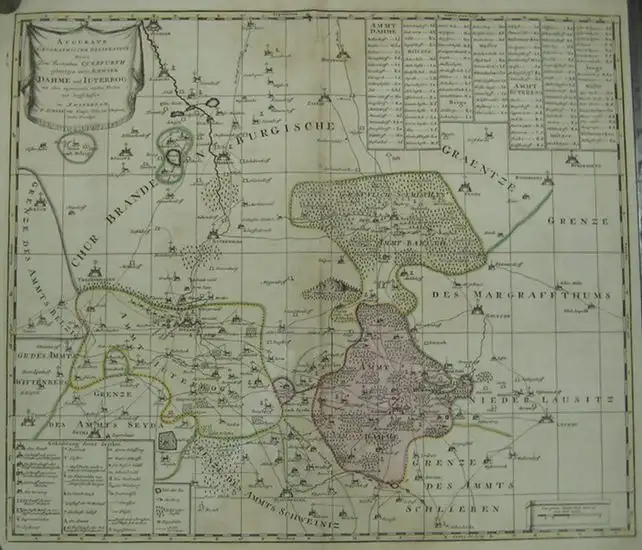 Blattgröße: 62 x 54,5 cm. Kartengröße: 58x50 cm. Gedruckte und mehrfarbig handcolorierte Originalkarte der Ämter Dahme, Jüterbog und Baruth in der Mark Brandenburg. Die Karte weist in den Ecken links oben eine Titelkartusche, rechts oben ein Ortssuchregister, links unten ein Legende sowie rechts unten einen Meilenzeiger ("Eine gemeine teutsche Meile deren 15. einen Grad machen") auf. Die Karte ist mit einem Gradnetz hinterlegt, welches die Breiten- und Längengraden anzeigt sowie eine alphabetische Beschriftung für das Suchregister. Die Karte ist an der oberen Kante mit kleinen Randeinrissen versehen. Die Mitte der Karte weist senkrecht eine Faltspur auf. Ebenso findet sich mittig sowohl oben als auch unten ein mit säurefreiem Filmoplast hinterlegter Einriss von ca. 4 cm. Insgesamt ist die Karte leicht gebräunt. Auf der Rückseite befindet sich eine Beschriftung mit Tinte des Vorbesitzers. Noch gut erhalten