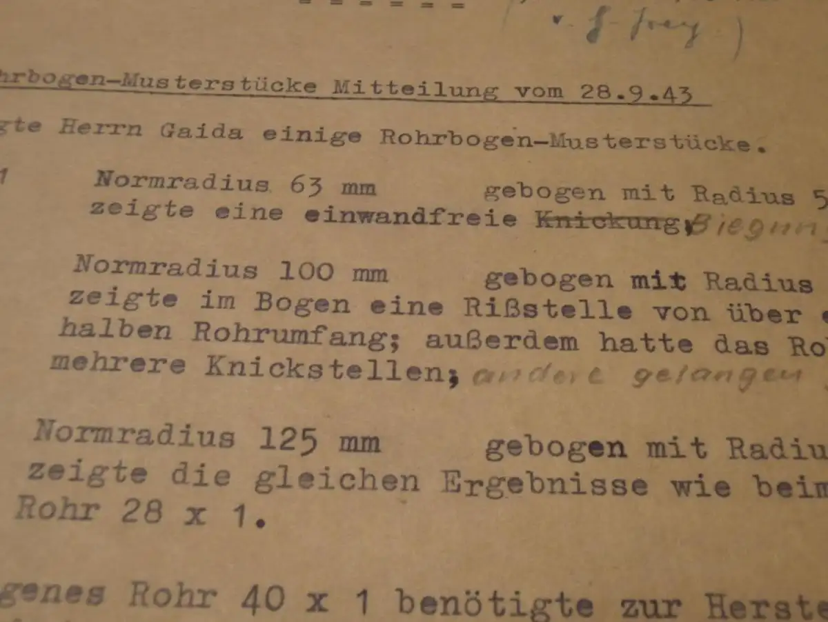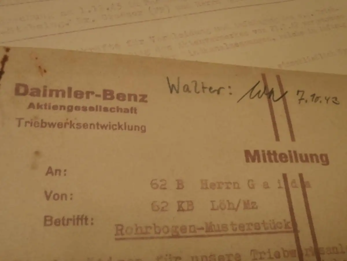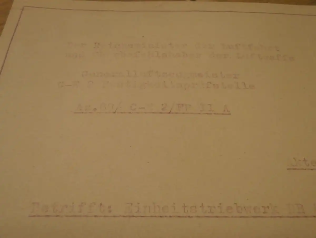 alte Dokumente Daimler Benz - Triebwerke , 1943 , Flugzeugbau , Versuchsprogramm , Backnang DB 603 Motor , Sindelfingen , Untertürkheim !!Dornier , Focke-Wulf , Messerschmitt , E`Stelle , PeenemündeAZ-K/4 Der Daimler-Benz DB 603 war ein flüssigkeitsgekühlter Zwölfzylinder-Flugmotor mit 44,5 Litern Hubraum und Benzindirekteinspritzung von Daimler-Benz. Von 1942 bis 1945 wurden insgesamt 8758 Motoren hergestellt.[1] Technik Um eine höhere Leistung für den Einsatzzweck als Antrieb für Bomber oder ähnliche mehrmotorige Flugzeuge zu erreichen, wurde aus dem „kleinen“ Flugmotor DB 605 (Hubraum 35,7 Liter) der DB 603 entwickelt. Wie dieser war er als V-Motor mit 60°-Bankwinkel und einer mechanischen Aufladung ausgelegt.Durch Vergrößerung der Bohrung des DB-605-Motors um 8 mm auf 162 mm und des Hubes von 160 mm auf 180 mm hatte der neue Motor 8,8 Liter mehr Hubraum. Der einzelne Zylinder hatte damit einen Hubraum von etwa 3,7 Litern. Die Startleistung der ersten Serienausführung DB 603 A betrug 1750 PS (1287 kW) bei 2700 min−1 (zum Vergleich: 1475 PS/1085 kW bei 2800 min−1 beim DB 605).Ein Charakteristikum des Daimler-Benz-Triebwerkes wie auch seiner Vorgänger seit dem 1932 gebauten Prototyp Daimler-Benz F4A war der Einbau mit „hängenden“ Zylindern (Kurbelwelle oben, daher auch „A-Motor“ genannt). Die hängende Anordnung erleichterte auch die Zugänglichkeit von Zylinderköpfen (Ventilsteuerung) und Zündkerzen bei der Wartung.Der Motorblock wurde aus Aluminiumguss gefertigt und enthielt stählerne Zylinderlaufbuchsen. Er hatte je Zylinderbank eine über Königswelle angetriebene obenliegende Nockenwelle (OHC-Ventilsteuerung), die pro Zylinder vier Ventile über Rollenschlepphebel betätigte. Jeder Nocken betätigte nacheinander ein Auslass- und ein Einlassventil. Die Auslassventile waren natriumgekühlt. Das Triebwerk hatte eine kontaktgesteuerte Doppelzündung (Bosch-Zwillingsmagnetzünder) mit zwei Zündkerzen (Bosch DW250ET 7-10) je Zylinder. Die Zündfolge des DB 603A war 1–11–2–9–4–7–6–8–5–10–3–12.Über eine Unterdruckeinrichtung höhenabhängig gesteuert, trieb die Kurbelwelle über eine hydraulische Kupplung den mechanischen Lader an. Dieser hatte die Aufgabe, den ansonsten mit zunehmender Höhe durch den abnehmenden Luftdruck sinkenden Füllungsgrad und den dadurch verursachten Leistungsabfall auszugleichen. Die Volldruckhöhe betrug 5700 Meter; darüber verlor der Motor kontinuierlich an Leistung.Zur Brennstoffversorgung diente eine Benzindirekteinspritzung mit mechanischer 12-Stempel-Einspritzpumpe. Der Ölvorrat wurde über eine Trockensumpfschmierung mit drei Ölpumpen umgewälzt (eine Druck- und zwei Saugpumpen; je Zylinderkopf eine). Die Motordrehzahl wurde über ein Luftschraubengetriebe mit geradverzahnten Stirnrädern untersetzt.Eine Sonderform stellte der Doppelmotor DB 613 dar, der aus zwei gekoppelten (spiegelbildlich aufgebauten) DB 603 bestand, die eine Propellerwelle antrieben.ProblemeBei der Einführung des DB 603 in den Jahren 1942/1943 gab es anfängliche Probleme mit der Zuverlässigkeit; die geplanten 100 Betriebsstunden bis zur Grundüberholung wurden erst 1944 annähernd erreicht. Zu Beginn mussten die Triebwerke oft schon nach 40 Betriebsstunden ausgetauscht werden.EinsatzDer DB 603 wurde in verschiedenen Versionen als Triebwerk für die Dornier Do 217, Dornier Do 335, Heinkel He 219, Messerschmitt Me 309, Focke-Wulf Ta 152, Messerschmitt Me 410 und Fiat G.56 eingesetzt.
