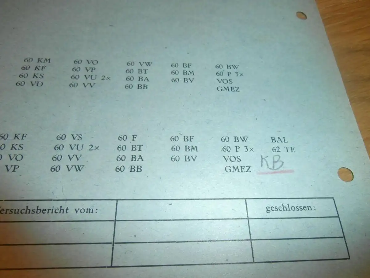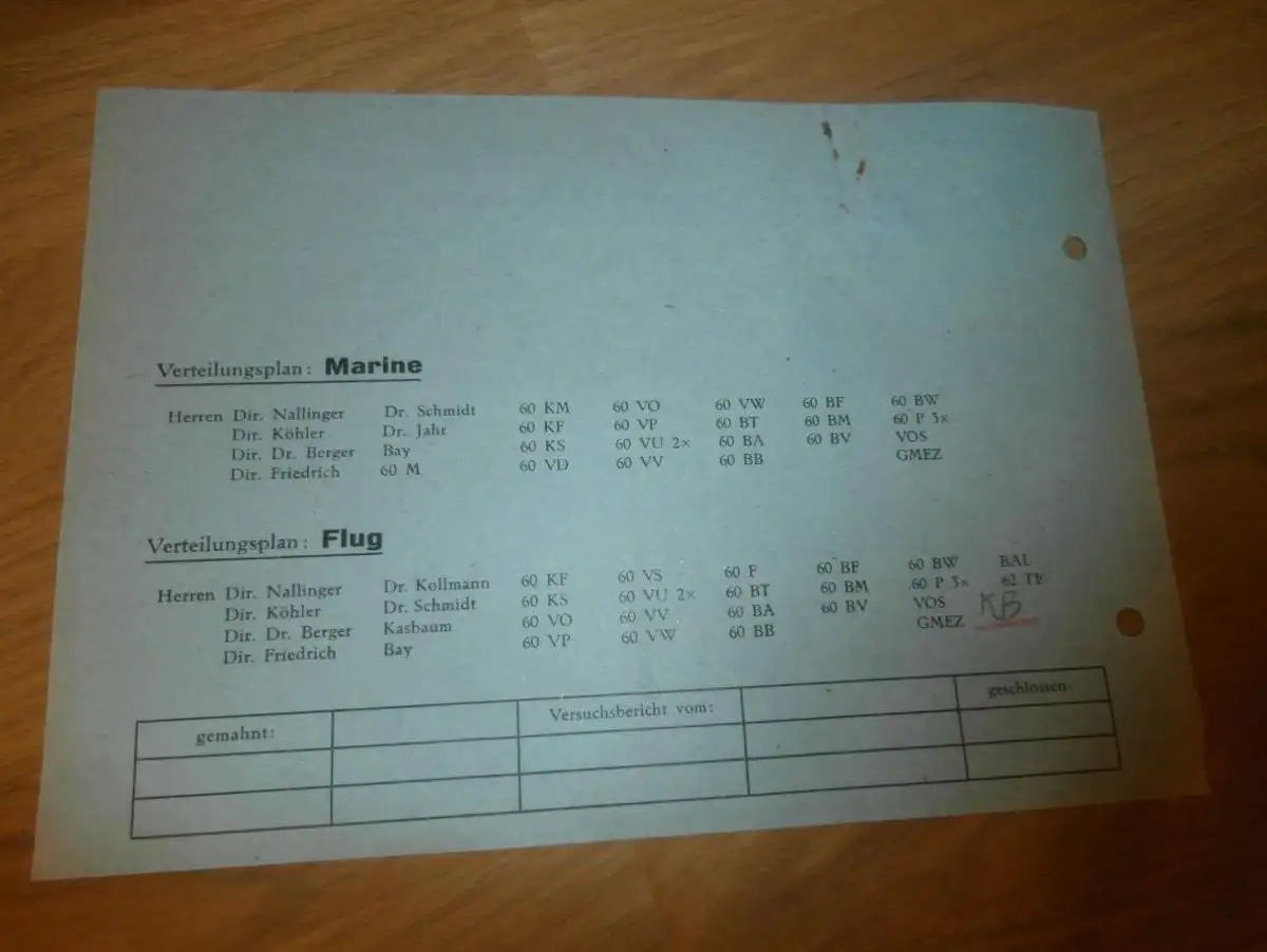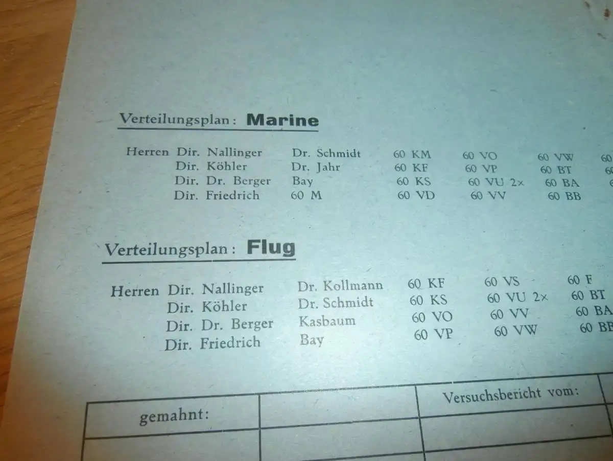 altes Dokument Daimler Benz - Triebwerke , 24.1.1944 , Flugzeugbau , Versuchsprogramm , Backnang DB 603 Motor , Sindelfingen , BMW Flugmotorenbau !!Dornier , Focke-Wulf , Messerschmitt , E`Stelle , PeenemündeAZ-K/4 Der Daimler-Benz DB 603 war ein flüssigkeitsgekühlter Zwölfzylinder-Flugmotor mit 44,5 Litern Hubraum und Benzindirekteinspritzung von Daimler-Benz. Von 1942 bis 1945 wurden insgesamt 8758 Motoren hergestellt.[1] Technik Um eine höhere Leistung für den Einsatzzweck als Antrieb für Bomber oder ähnliche mehrmotorige Flugzeuge zu erreichen, wurde aus dem „kleinen“ Flugmotor DB 605 (Hubraum 35,7 Liter) der DB 603 entwickelt. Wie dieser war er als V-Motor mit 60°-Bankwinkel und einer mechanischen Aufladung ausgelegt.Durch Vergrößerung der Bohrung des DB-605-Motors um 8 mm auf 162 mm und des Hubes von 160 mm auf 180 mm hatte der neue Motor 8,8 Liter mehr Hubraum. Der einzelne Zylinder hatte damit einen Hubraum von etwa 3,7 Litern. Die Startleistung der ersten Serienausführung DB 603 A betrug 1750 PS (1287 kW) bei 2700 min−1 (zum Vergleich: 1475 PS/1085 kW bei 2800 min−1 beim DB 605).Ein Charakteristikum des Daimler-Benz-Triebwerkes wie auch seiner Vorgänger seit dem 1932 gebauten Prototyp Daimler-Benz F4A war der Einbau mit „hängenden“ Zylindern (Kurbelwelle oben, daher auch „A-Motor“ genannt). Die hängende Anordnung erleichterte auch die Zugänglichkeit von Zylinderköpfen (Ventilsteuerung) und Zündkerzen bei der Wartung.Der Motorblock wurde aus Aluminiumguss gefertigt und enthielt stählerne Zylinderlaufbuchsen. Er hatte je Zylinderbank eine über Königswelle angetriebene obenliegende Nockenwelle (OHC-Ventilsteuerung), die pro Zylinder vier Ventile über Rollenschlepphebel betätigte. Jeder Nocken betätigte nacheinander ein Auslass- und ein Einlassventil. Die Auslassventile waren natriumgekühlt. Das Triebwerk hatte eine kontaktgesteuerte Doppelzündung (Bosch-Zwillingsmagnetzünder) mit zwei Zündkerzen (Bosch DW250ET 7-10) je Zylinder. Die Zündfolge des DB 603A war 1–11–2–9–4–7–6–8–5–10–3–12.Über eine Unterdruckeinrichtung höhenabhängig gesteuert, trieb die Kurbelwelle über eine hydraulische Kupplung den mechanischen Lader an. Dieser hatte die Aufgabe, den ansonsten mit zunehmender Höhe durch den abnehmenden Luftdruck sinkenden Füllungsgrad und den dadurch verursachten Leistungsabfall auszugleichen. Die Volldruckhöhe betrug 5700 Meter; darüber verlor der Motor kontinuierlich an Leistung.Zur Brennstoffversorgung diente eine Benzindirekteinspritzung mit mechanischer 12-Stempel-Einspritzpumpe. Der Ölvorrat wurde über eine Trockensumpfschmierung mit drei Ölpumpen umgewälzt (eine Druck- und zwei Saugpumpen; je Zylinderkopf eine). Die Motordrehzahl wurde über ein Luftschraubengetriebe mit geradverzahnten Stirnrädern untersetzt.Eine Sonderform stellte der Doppelmotor DB 613 dar, der aus zwei gekoppelten (spiegelbildlich aufgebauten) DB 603 bestand, die eine Propellerwelle antrieben.ProblemeBei der Einführung des DB 603 in den Jahren 1942/1943 gab es anfängliche Probleme mit der Zuverlässigkeit; die geplanten 100 Betriebsstunden bis zur Grundüberholung wurden erst 1944 annähernd erreicht. Zu Beginn mussten die Triebwerke oft schon nach 40 Betriebsstunden ausgetauscht werden.EinsatzDer DB 603 wurde in verschiedenen Versionen als Triebwerk für die Dornier Do 217, Dornier Do 335, Heinkel He 219, Messerschmitt Me 309, Focke-Wulf Ta 152, Messerschmitt Me 410 und Fiat G.56 eingesetzt.