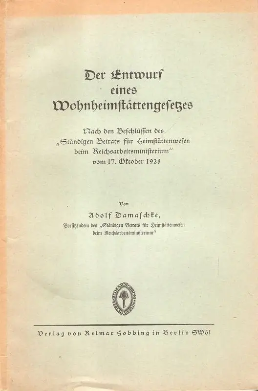 Damaschke, Adolf: Der Entwurf eines Wohnheimstättengesetzes. Nach d. Beschlüssen d. "Ständigen Beirats f. Heimstättenwesen beim Reichsarbeitsministerium" vom 17 Okt. 1928.