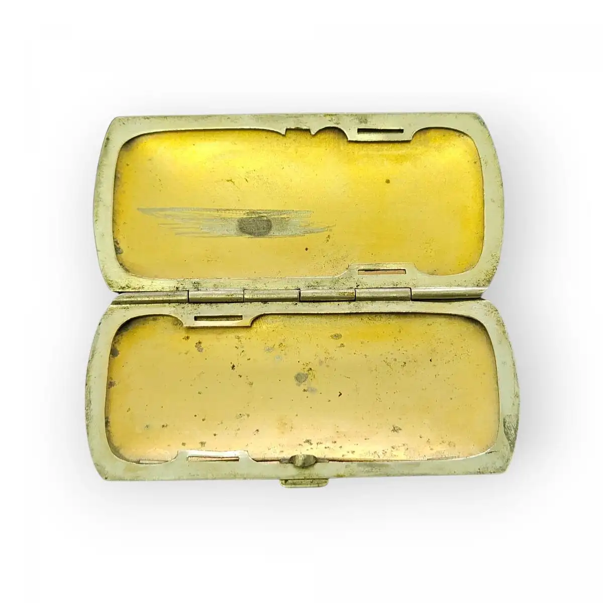 Innen vergoldet - mit Kratzspuren - Außen etwas angegriffen - fehlende Bänder - denoch schönes Design - schließt gut
