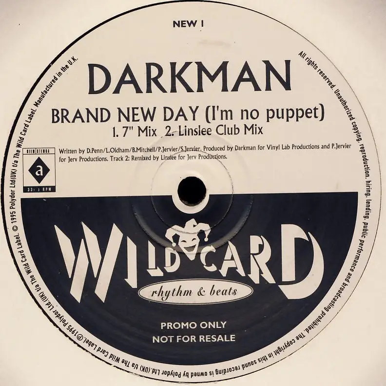 12" Maxi Darkman - Brand New Day I'm No Puppet, unité de la société de disques avec autocollants d'information, état plaque M- housse VG+; Fabriqué dans United Kingdom 1995 Wildcard NEW 1, Tracks [7&qot, Mix], [Linslee Club Mix] [Harlesden Mix].