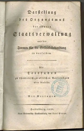 Darstellung des Organismus der innern Staatsverwaltung und der Formen für die Geschäftsbehandlung in derselben. Als Leitfaden zu theoretisch-praktischen Vorlesungen über dieselbe. Mit Beilagen Heidelberg, Neue Akademische Buchhandlung von Karl Groos, 182