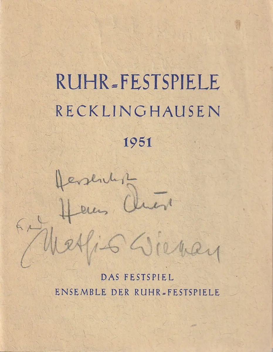 Signiert von: Hans Quest, Mathias Wieman, Heidemarie Hatheyer, Walter Franck, Bernhard Minetti, Antje Weisgerber. Inszenierung: Karl Heinz Stroux. Bühne und Kostüme: Kar Gröning. Mitwirkende: Walter Franck, Antje Weisgerber, Hans Quest, Luise Franke=Booch, Heidemarie Hatheyer, Renate Hofrichter, Edith Lechtape, Mathias Wieman, Gerhard Just, Robert Taube, Bernhard Minetti, u.a. - Theaterprogramm, Opernprogramm, Ballettprogramm, Musicalprogramm, Konzertprogramm, Theatermemorabilia, Programmhefte Sammlung, deutsche Theatergeschichte.