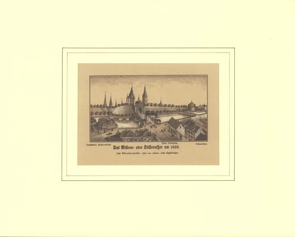 Druck und Verlag von Rudolph Senf, Hoflithograph, Hamburg, Rödingsmarkt 12 / Commissionsverlag von G. W. Niemeyer Nachflger. (Inh. G. Wolfhagen). Gedruckte Detailbezeichnungen: "Neustädter Fuhlentwiete", "Alter Steinweg", "Schaarthor" und "Jetzt Ellernthorsbrücke, 1546 neu erbaut, 1668 abgebrochen". Nach der Lithographie ""Das alte Millern oder Düstern Thor in Hamburg im Jahre 1600" von Peter Suhr (Orig.-Format 24 x 36 cm; um 1840). - Verso kl. Sammlerstempel v. Carl Thinius