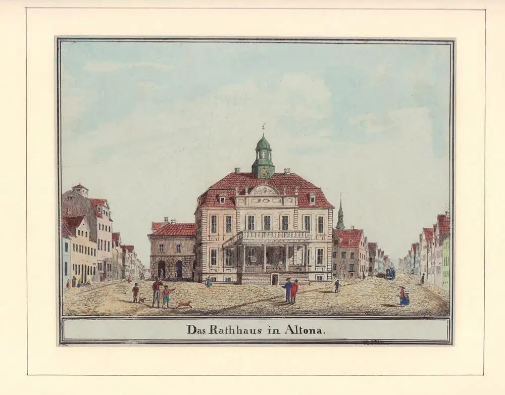 Das von Claus Stallknecht (1681-1734) erbaute Altonaer Rathaus zwischen der Langen Straße und der Königstraße in der Zeit zwischen 1820 und 1867. In diesen Jahren wies der Bau einen von Landesbaumeister Christian Frederik Hansen erweiterten Balkon auf; diese "unschöne Ergänzung", erbaut um der besseren Inszenierung willen, wurde 1867 wieder entfernt. (vgl. Hornauer/Kaufmann, Das Altonaer Rathaus, S. 22). Belebte Staffage mit Menschen und ein Pferdefuhrwerk, hinter den Häusern der Königstraße ragt die Turmspitze der St. Trinitatiskirche hervor. - Schönes, sauberes Blatt des seltenen Motivs