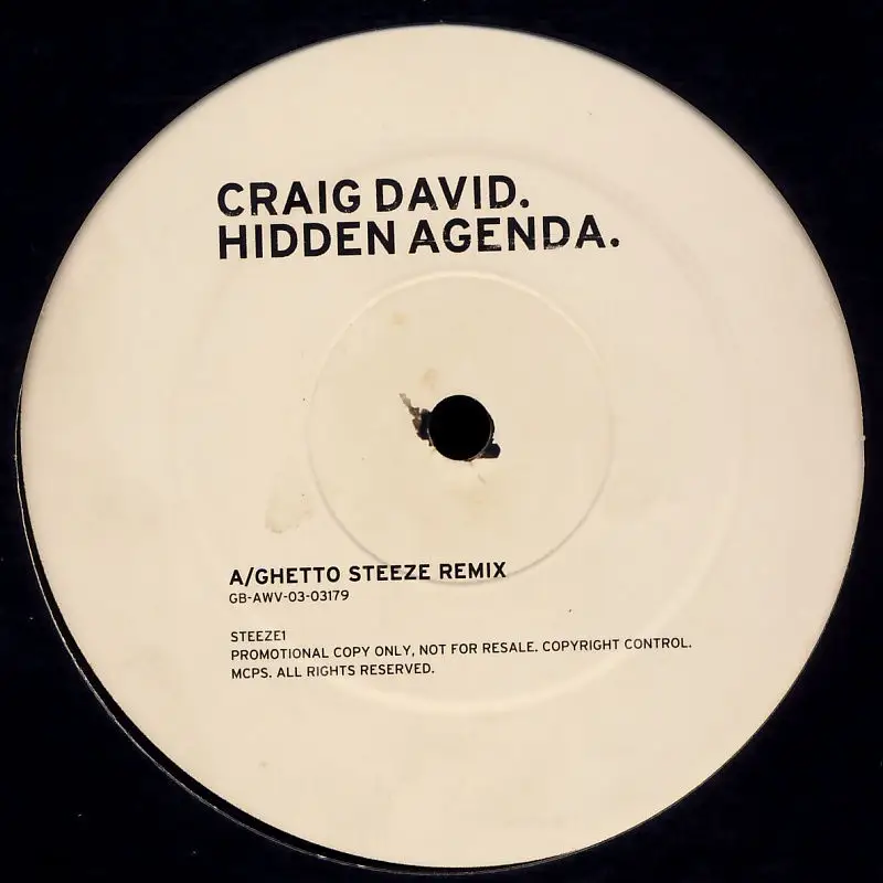12" Maxi Craig David - Hidden Agenda, Promo, Couverture neutre, État Platte VG; Fabriqué dans United Kingdom 2003 Steeze1, Tracks [Ghetto Steeze RMX], [ghetto Stezé Instr.]