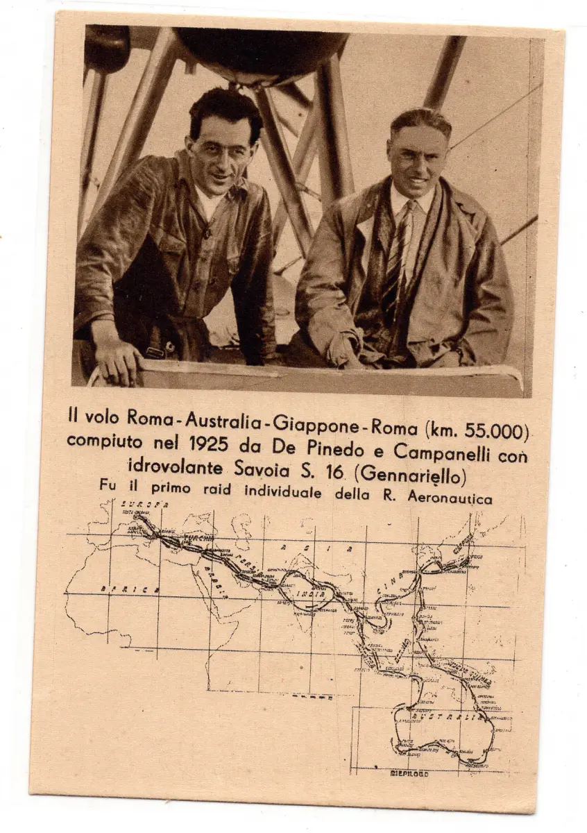 C - De Pinedo - Postkarte Erinnerung an den Luftangriff Rom - Australien - Japan 1925 von De Pinedo und Campanelli mit dem Wasserflugzeug Savoia S. 16 (Gennariello) - Die Postkarte, die 1933 anlässlich des ersten Jahrzehnts der Luftwaffe hergestellt wurde, zeigt die beiden Piloten oben und unten auf der Route - neue perfekte Cod.128/182