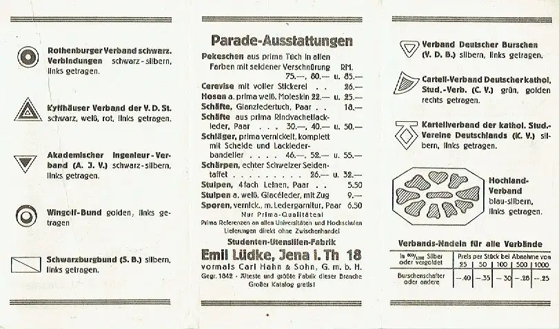 guter bis sehr guter Zustand, geringe Gebrauchs- und Alterungsspuren: Seiten teils etwas eselsohrig - Rückseite an kleiner Stelle Schrift abgewetzt, dadurch auch durchscheinend (ca. 1 cm im Durchmesser), undatiert, aber Preise in Reichsmark, hergestellt also nach 1924 Werbeprospekt der Firma, vormals Carl Hahn & Sohn, Papier, ca. 7 x 12, Leporello mit 12 Seiten