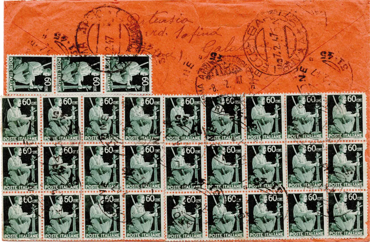 Umschlag - Democratica Cent. 60 Nr. 548 35 Exemplare + Ergänzungen Cent. 10 Nr. 543 zehn Exemplare auf Umschlag Racc. am 7.2.47 - Seltene Mehrfachfrankatur mit nur niedrigen Werten der Serie, im Tarif (drei Häfen) - einige Briefmarken mit Mängeln, die beidseitig am Umschlag angebracht sind - Interessanter Cod. 240/17