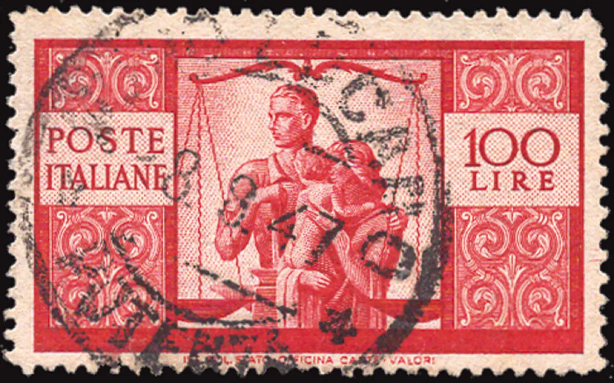 GEBRAUCHT - Democratica Lire 100 Nr. 565 dunkles Karmin, erste Verzahnungsplatte 14,1/4-fach 58 - Uncommon Cod.569/182