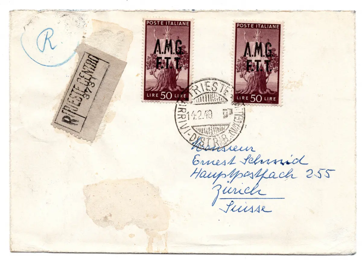 Democratica Lire 50 Nr. 16 zwei Exemplare auf Umschlag Racc. für die Schweiz - Im Tarif Nr. 992/20