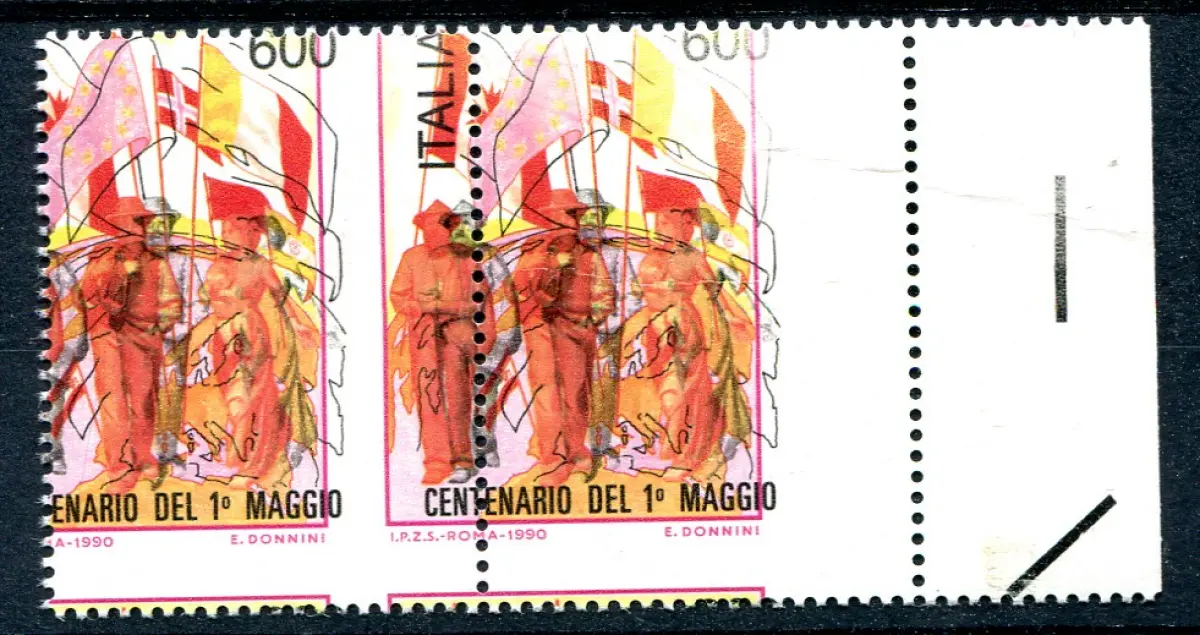 Mai ohne Blaudruck Blattrandpaar - Sorte Hundertjahrfeier I. Mai, horizontales Paar ohne Blaudruck, andere Farben außerhalb des Registers und stark in beide Richtungen verschoben - die Briefmarke rechts ist teilweise weiß, nur 5 Exemplare des Bogens weisen diese Eigenschaft auf - Neu mit Vollgummi - Selten Cod. 385/WEB
