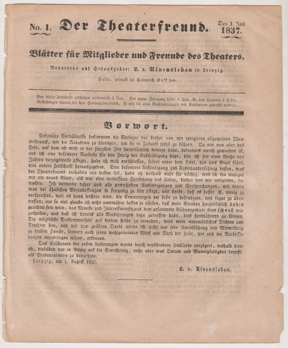ArtikeldetailsDer Theaterfreund No. 1 / 1837 Blätter für Mitglieder und Freunde des TheatersAlvensleben, L. v.