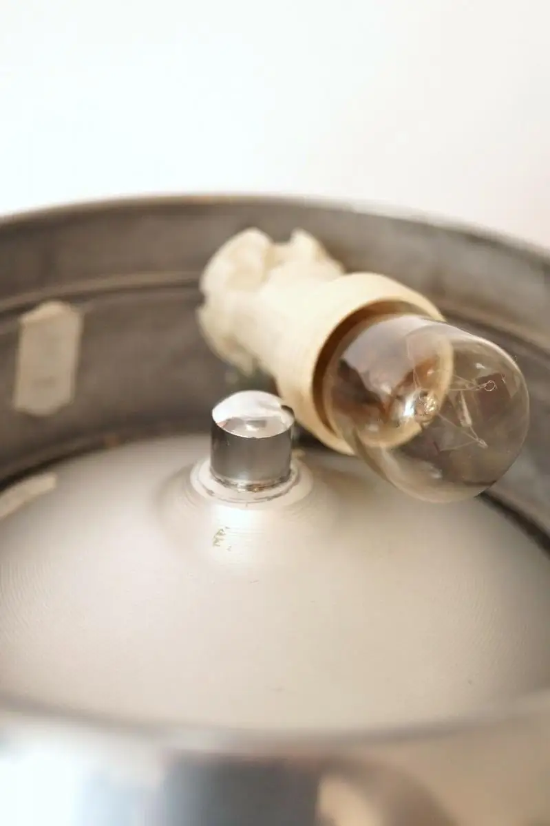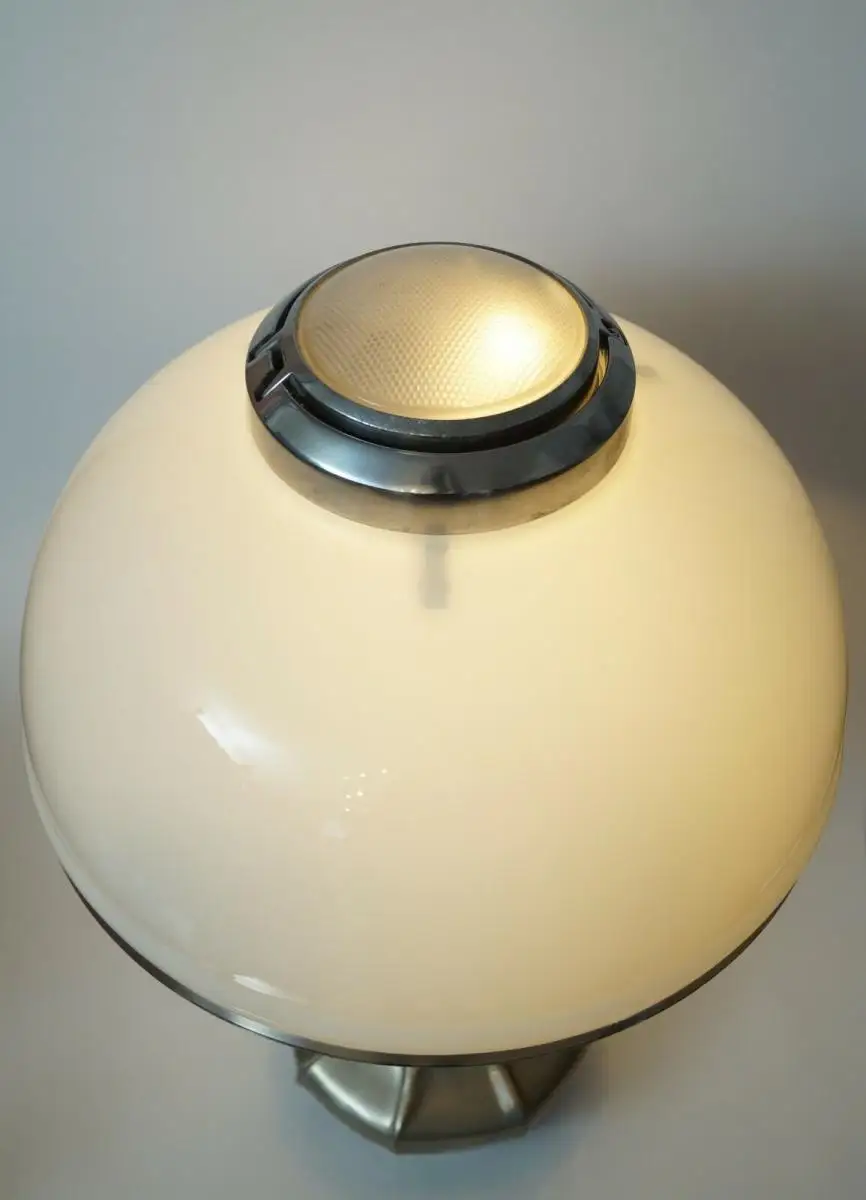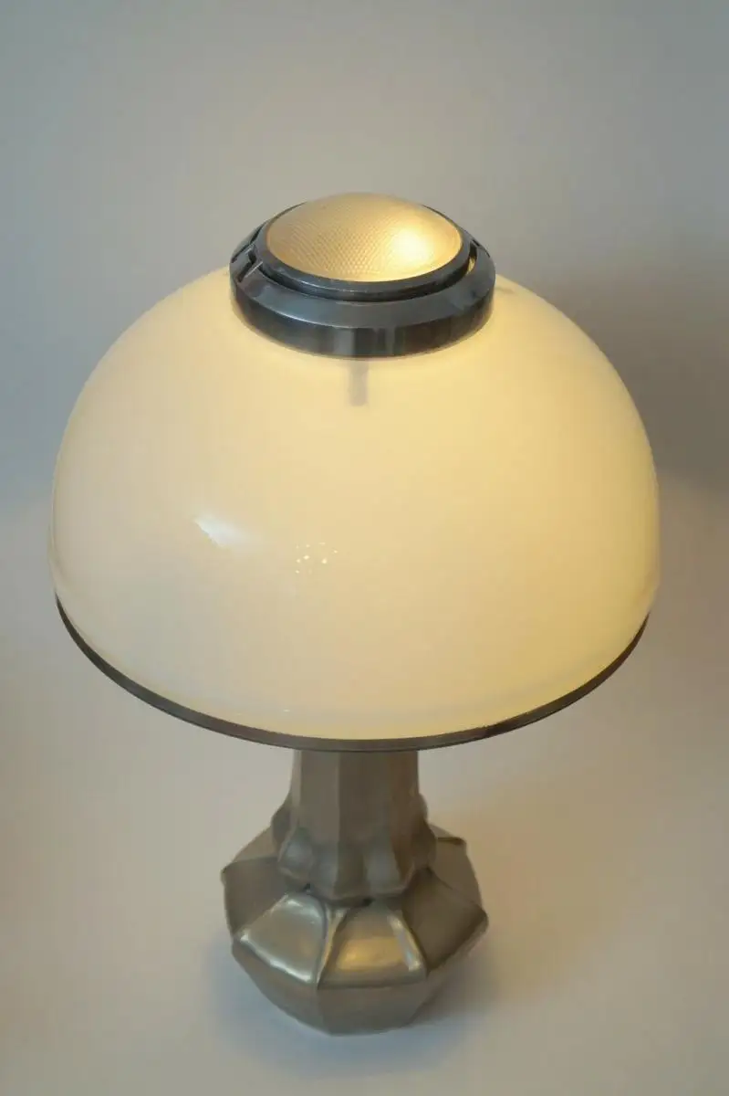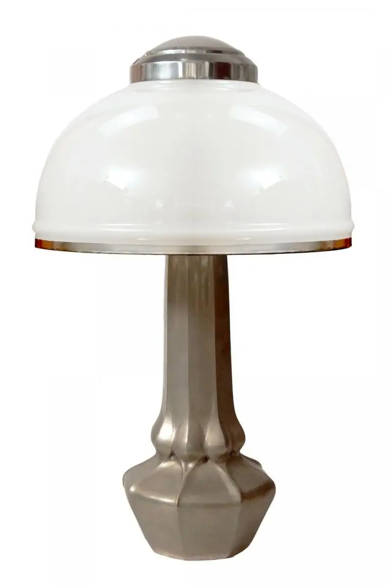 Lampe de table "COIT TOWER" Unikat, montage en aluminium, verre opale, hauteur totale d'environ 68 cm, toute nouvelle électricien Énorme et très lourde Lumières de fond/sol/tablette " COITTOWer ." Unicat mondial, seulement disponible une fois chez nous. Monture en Aluminium articial, nickelé avec une belle patine. Verre opal avec des bandes de peinture argentées, partiellement touché (voir photos détaillées). Couvercle final est une lampe propre avec couvercle pliable. Elle fixe l'écran et est intégrée par connexion. Hauteur totale environ 68cm, diamètre de l ' parapluie env. 40 cm - veuillez noter l\'énorme taille lors du choix de la lampe! Installation électrique entièrement renouvelée. Installation en PVC avec interrupteur à boucles. 2 x E27 version standard jusqu\\m max. 75 Watt, 1 x U14 version Standard, jusqu'à 25 Wt - nous recommandons vivement LED Light Luchtewehre Des pièces de rechange comme des vis ou des disques ont été renouvelées .