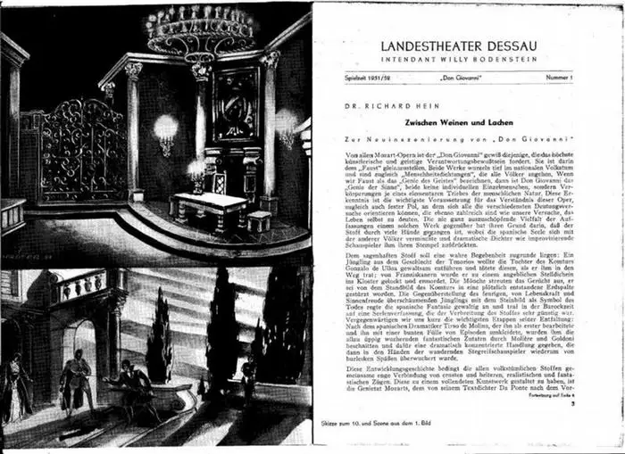 Titel: Landestheater Dessau. Spielzeit 1951 / 1952, Nummer 1. - Mit Besetzungsliste zu: Don Giovanni ( Wolfgang Amadeus Mozart ). - Inszenierung: Richard Hein. - Bühnenbild: Manfred Schröter. - Darsteller: Toni Weiler, Katharina Nicolai, Albert Göse, Karl Ludwig Gottschall, Anita Allwardt u. a. - Weiterer Inhalt: R. Hein - Zur Neuinszenierung / Inhalt der Oper u. a.