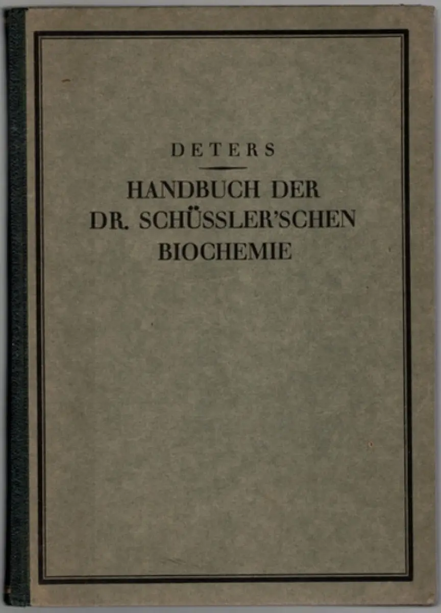 Deters, Hermann: Handbuch der Dr. Schüsslerschen [Schüssler'schen] Biochemie. Die Dr. Schüsslersche Biochemie, eine wissenschaftliche Ionen-Reiz-Konstitutions- und Nährsalzlehre. Allverständliche moderne Lebens- und Heillehre. Mit über 100 Textbildern und