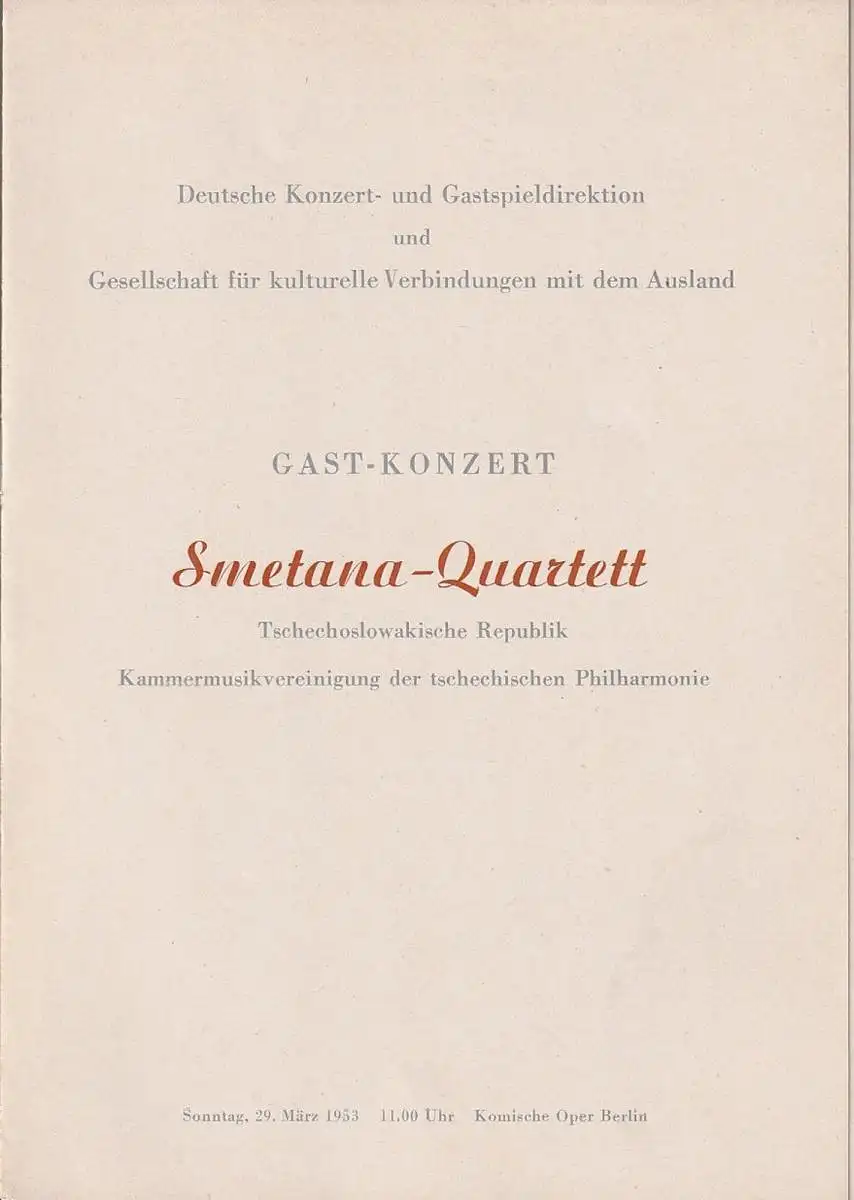 Deutsche Konzert- und Gastspieldirektion und Gesellschaft für kulturelle Verbindungen mit dem Ausland: Programmheft GAST - KONZERT SMETANA - QUARTETT 29. März 1953 Komische Oper Berlin.