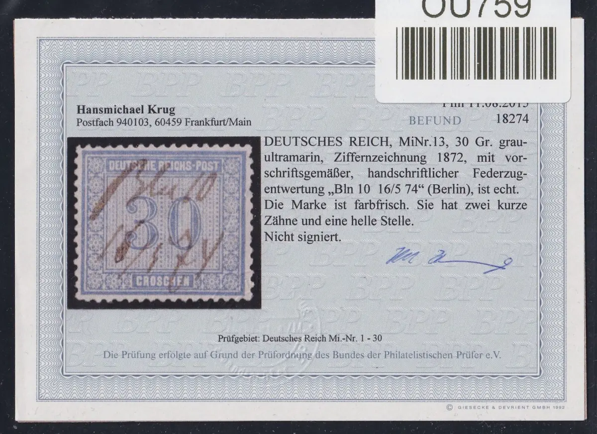 Deutsches Reich 13 gestempelt Befund Krug BPP, Federzugentwertung #OU759