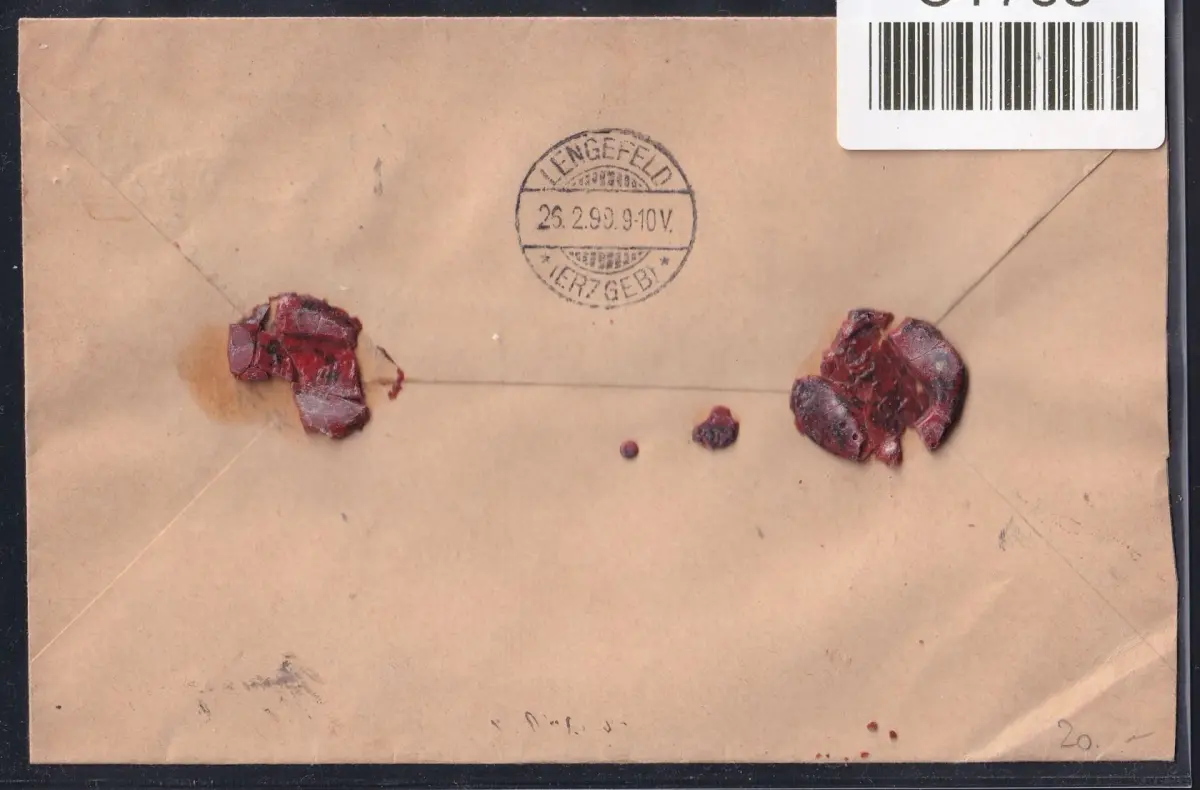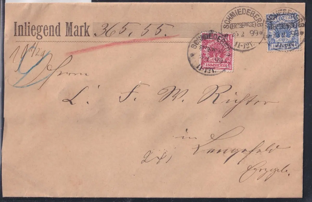 10+20 Pfennig Reichsadler als Mischfrankatur auf Wertbrief portogerecht am 25.2.1899 von Schmiedeberg nach Lengefeld gelaufen.