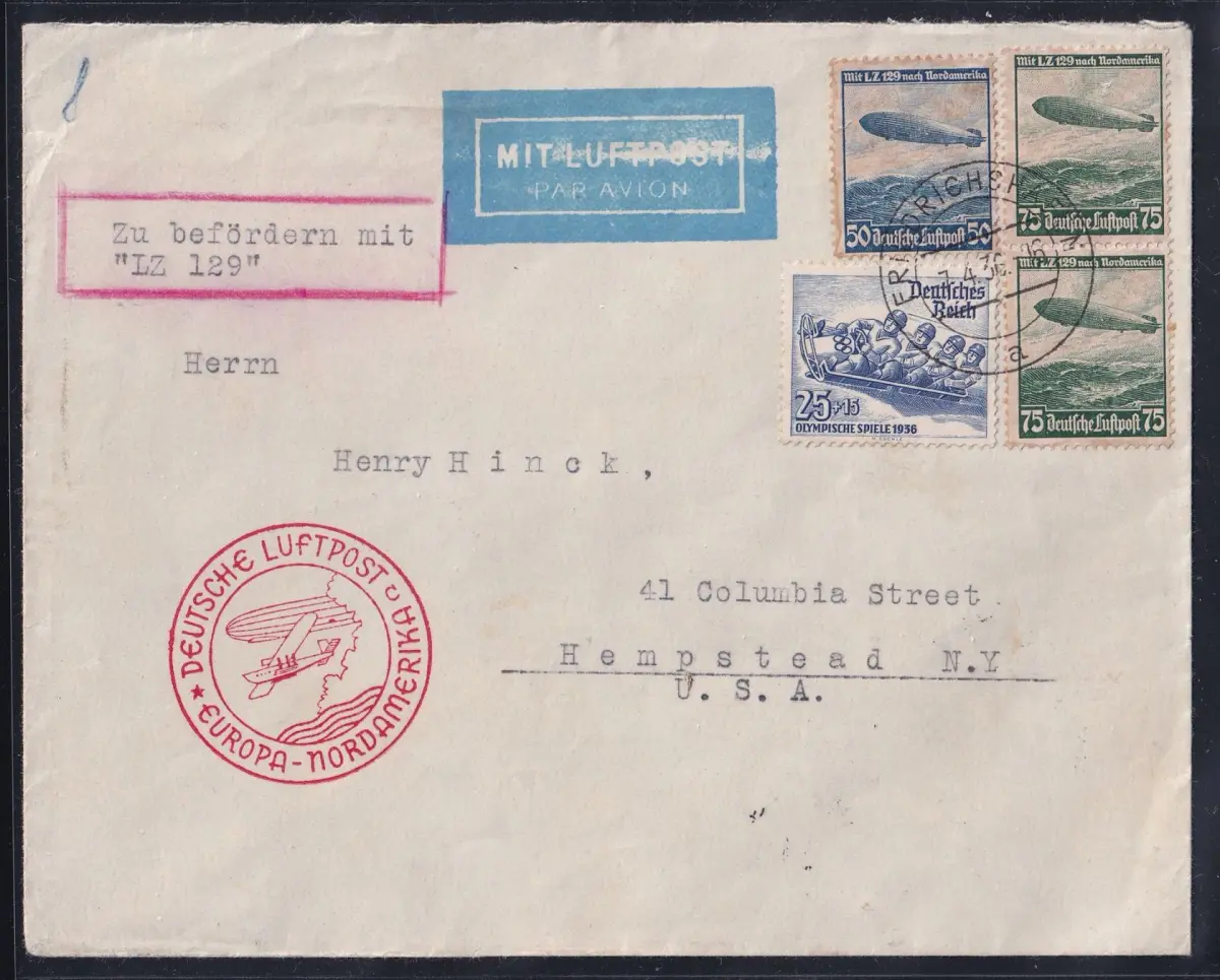 25 Pfennig Olympiade und 50+75 Pfennig Flugpostmarken als Mischfrankatur auf Zeppelinbrief mit LZ 129 am 7.4.1936 von Friedrichshafen nach New York USA gelaufen.