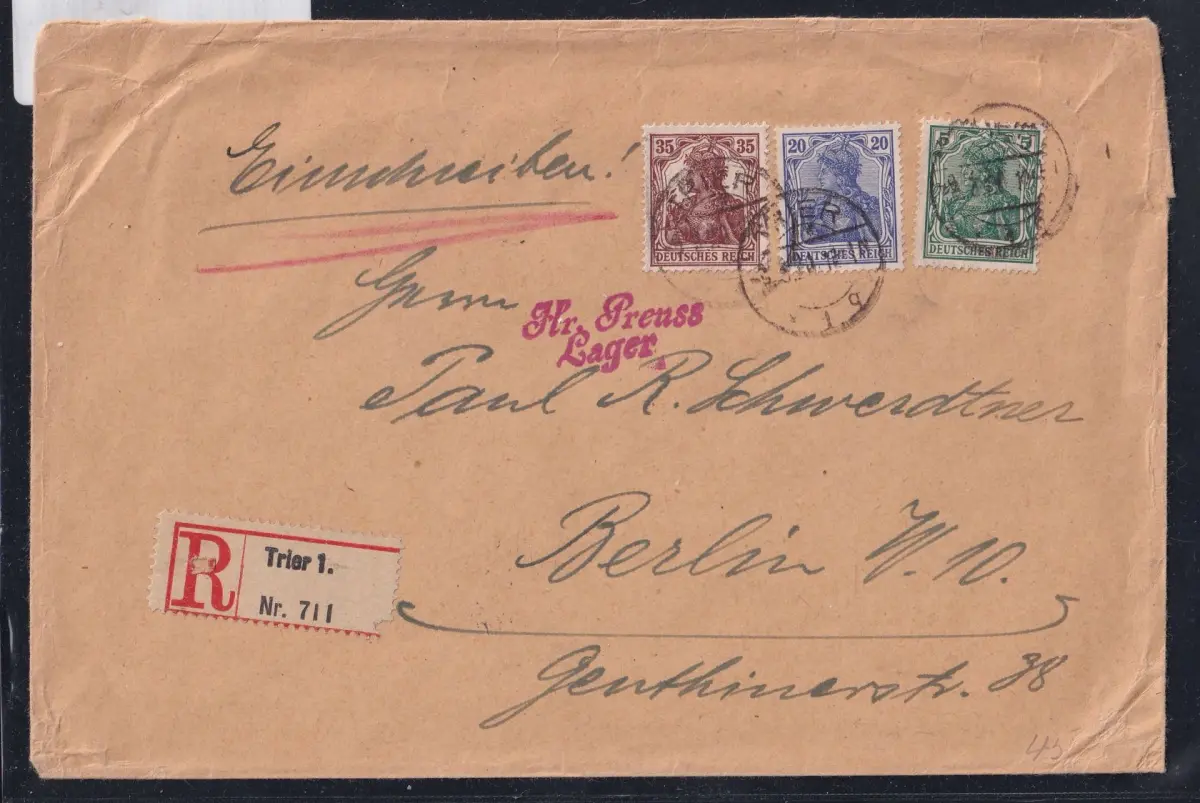 Fernbrief Einschreiben mit Germania- Marken portogerecht am 9.7.1920 mit seltenem roten L 2 Hr. Preuss Lager von Trier nach Berlin gelaufen.