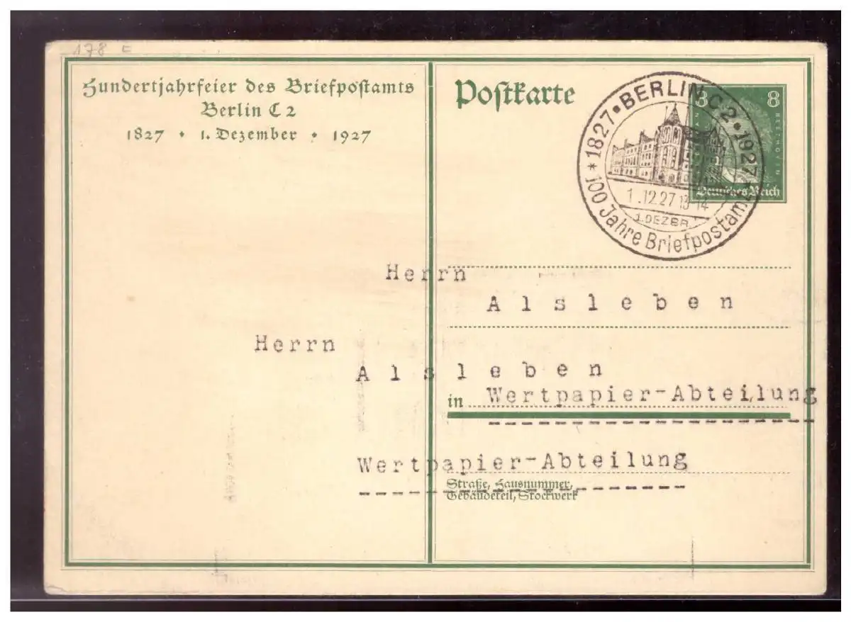 Dt- Reich (020586) Ganzsache P 179 mit Sonderstempel FDC vom 1.12.1927, Berlin C2