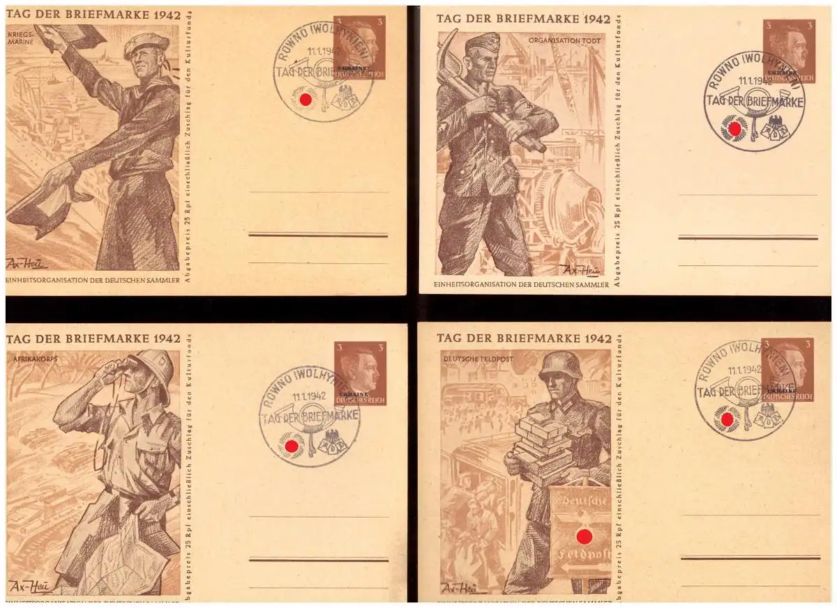 Dt.- Reich WKII (020156) Propaganda Ganzsache Ukraine P4/ 1-4, blanco gestempelt mit SST Rowno Tag der Briefmarke