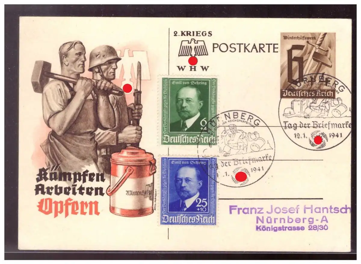 Dt.- Reich (009916) Propaganda Ganzsache P291 Kämpfen, Arbeiten, Opfern mit Zusatzfrankatur mit SST Nürnberg 19.1.1941
