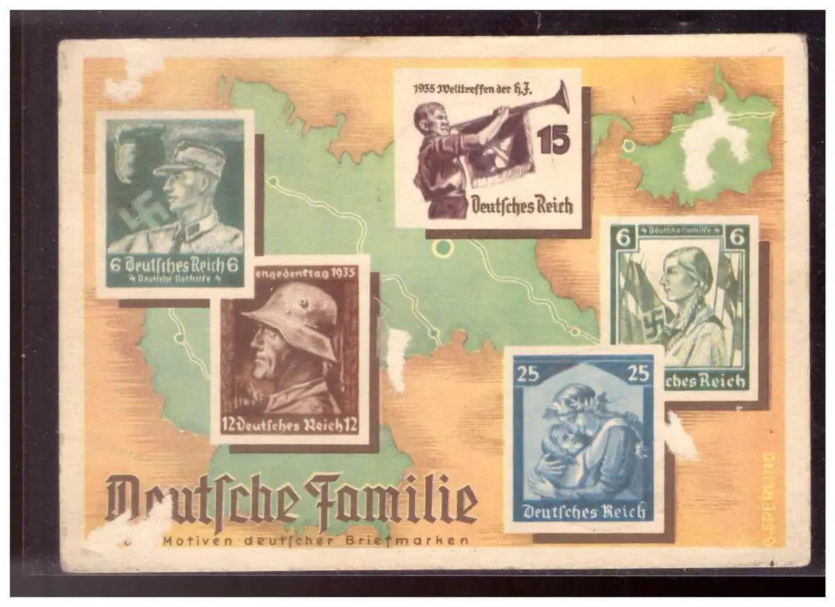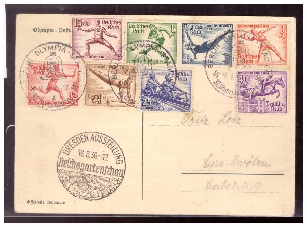 Dt- Reich (020089) Propagandakarte Deutsche familie mit kompletten Olympiasatz mit Sonderstempel Olympia- Stadion