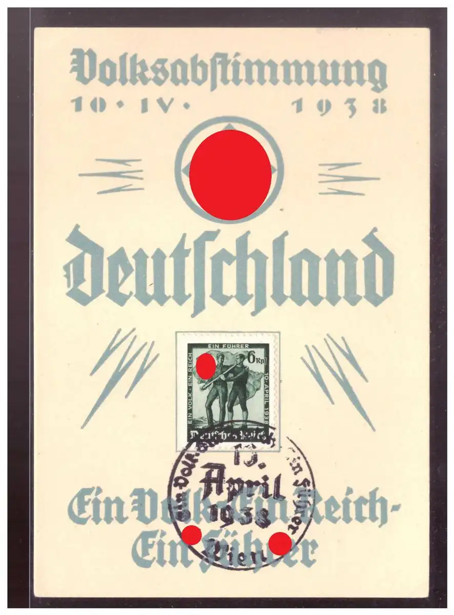 DT- Reich (020116) Propaganda, Gedenkarte Volksabstimmung Deutschland 10.4.1938, Ein Volk Ein Reich Ein Führer gestempel