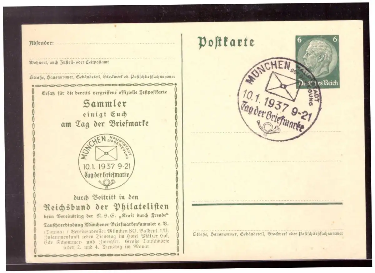 Dt- Reich (020175) Privatganzsache PP127/ C26 Tag der Briefmarke München mit blanco Sonderstempel vom 10.1.1937