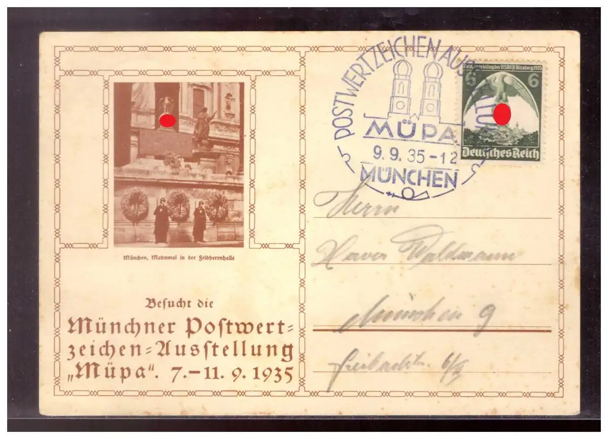 Dt- Reich (021821) Postkarte mit Mahnmal Feldherrenhalle, Münchner Postertzeichenausstellung Müpa 1935, gelaufen mit SST