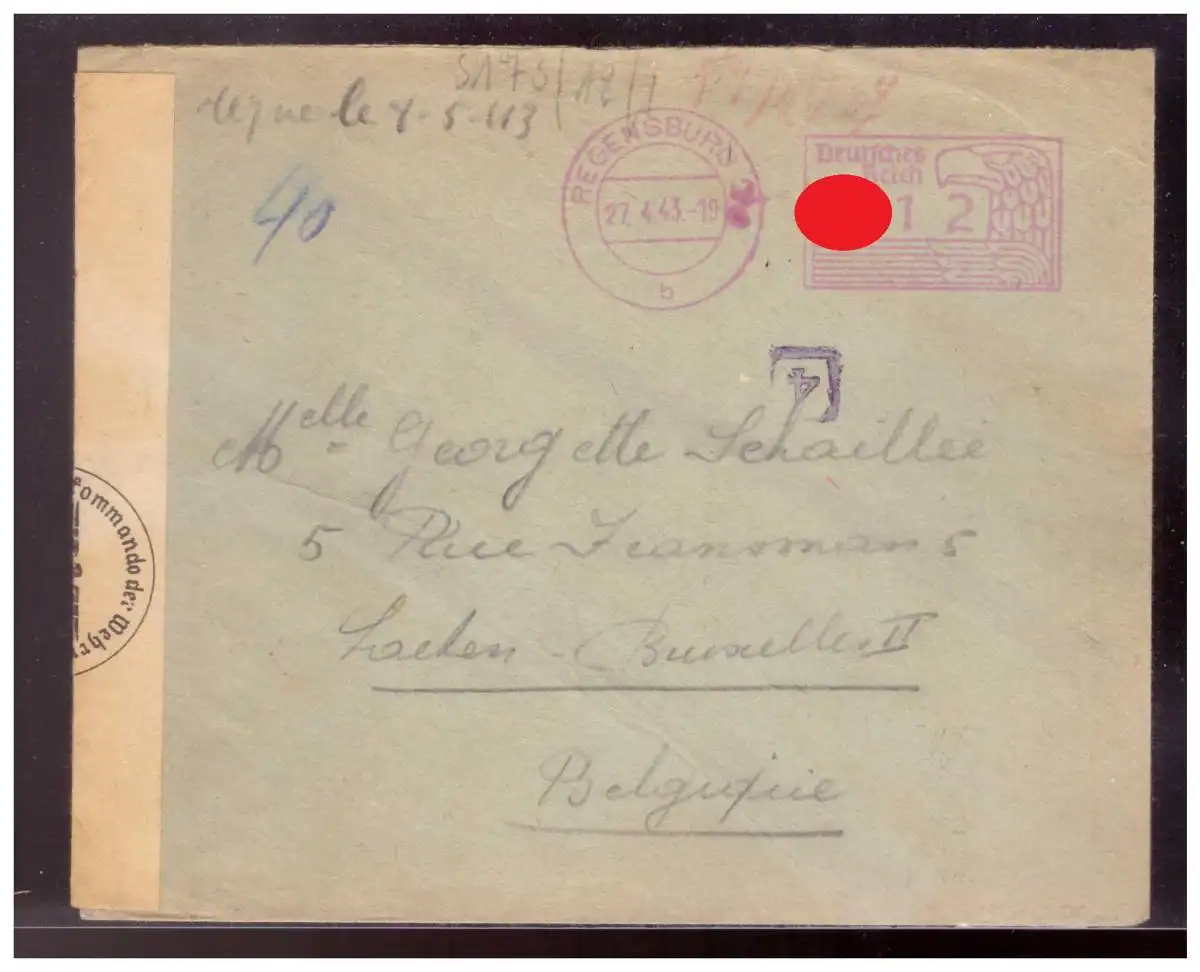 Dt- Reich (022209) AFS auf Fremdarbeiterbrief aus dem Lager Lohgraben/ Regensburg 27.3.43 nach Brüssel, Prüfung ABP Köln