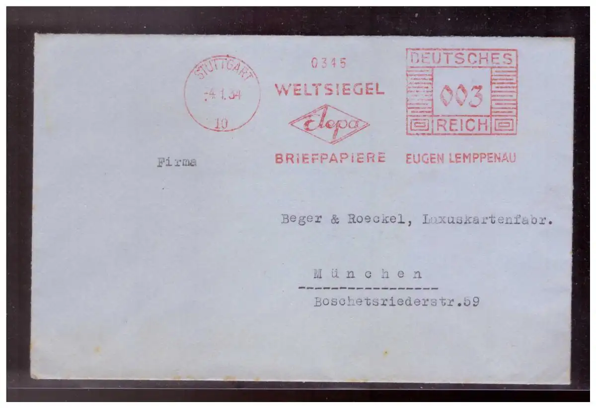 Dt- Reich (022349) Umschlag mit Freistempler Weltsiegel Briefpapiere Eugen Lemppenau Stuttgart, gel. 4.1.1934