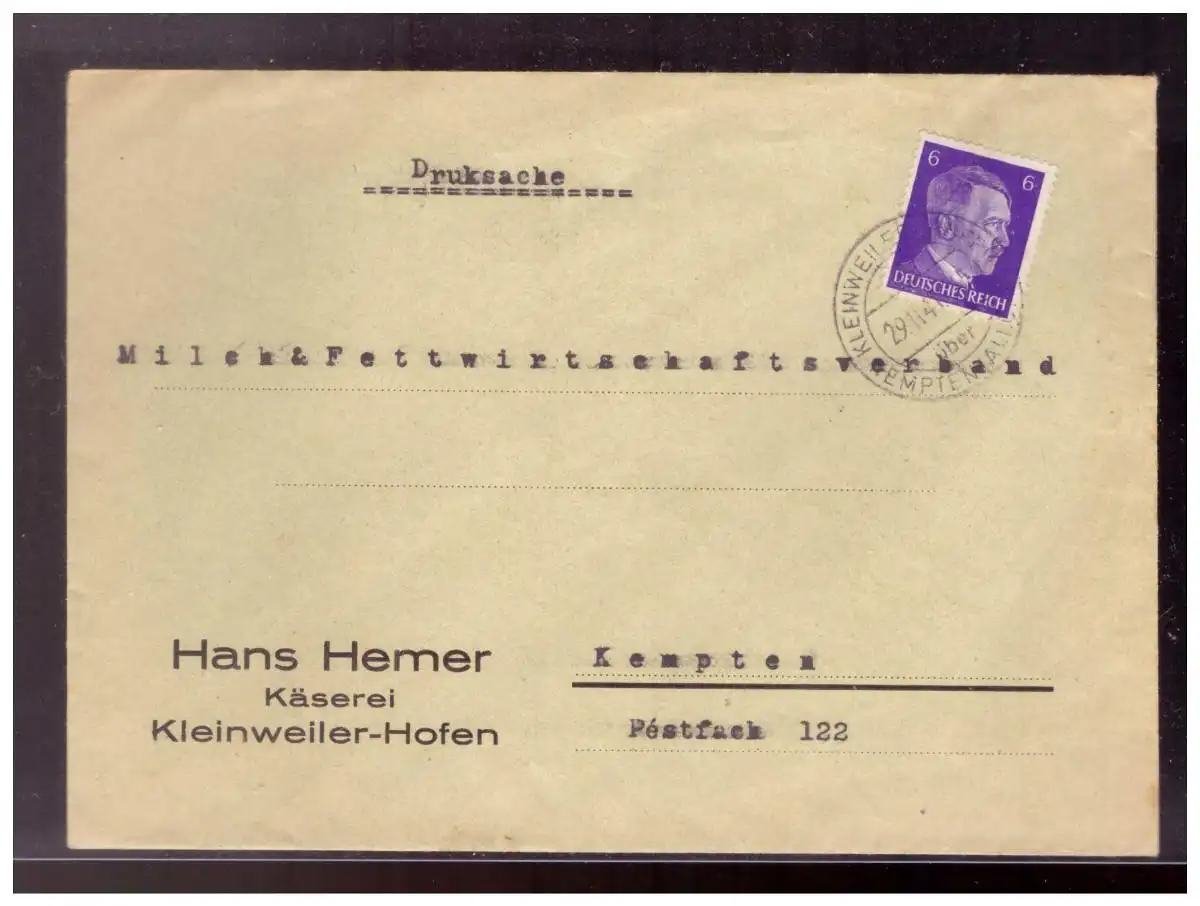 Dt-Reich (022678) Brief mit privaten Firmenzudruck Drucksache Käserei Hans Hemer Kleinweiler-Hofen, gelaufen Kleinweiler