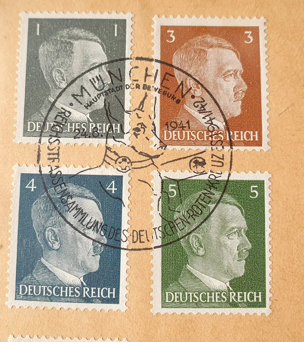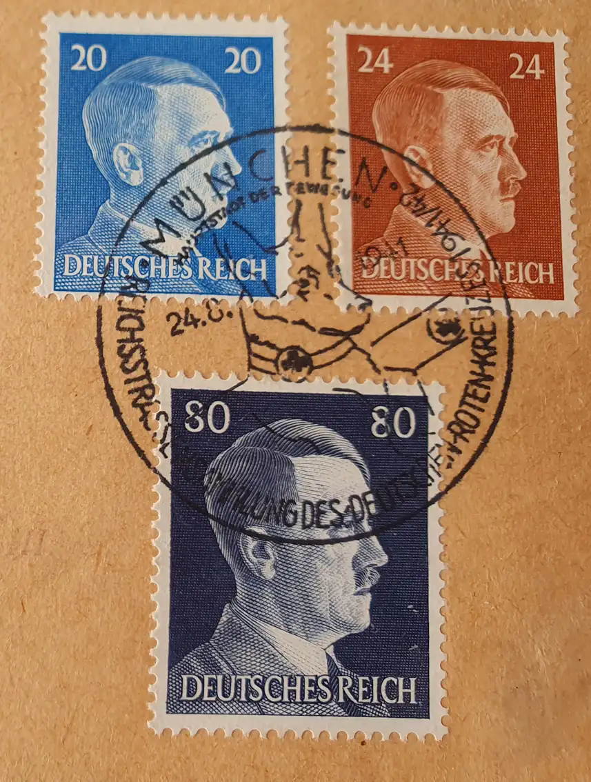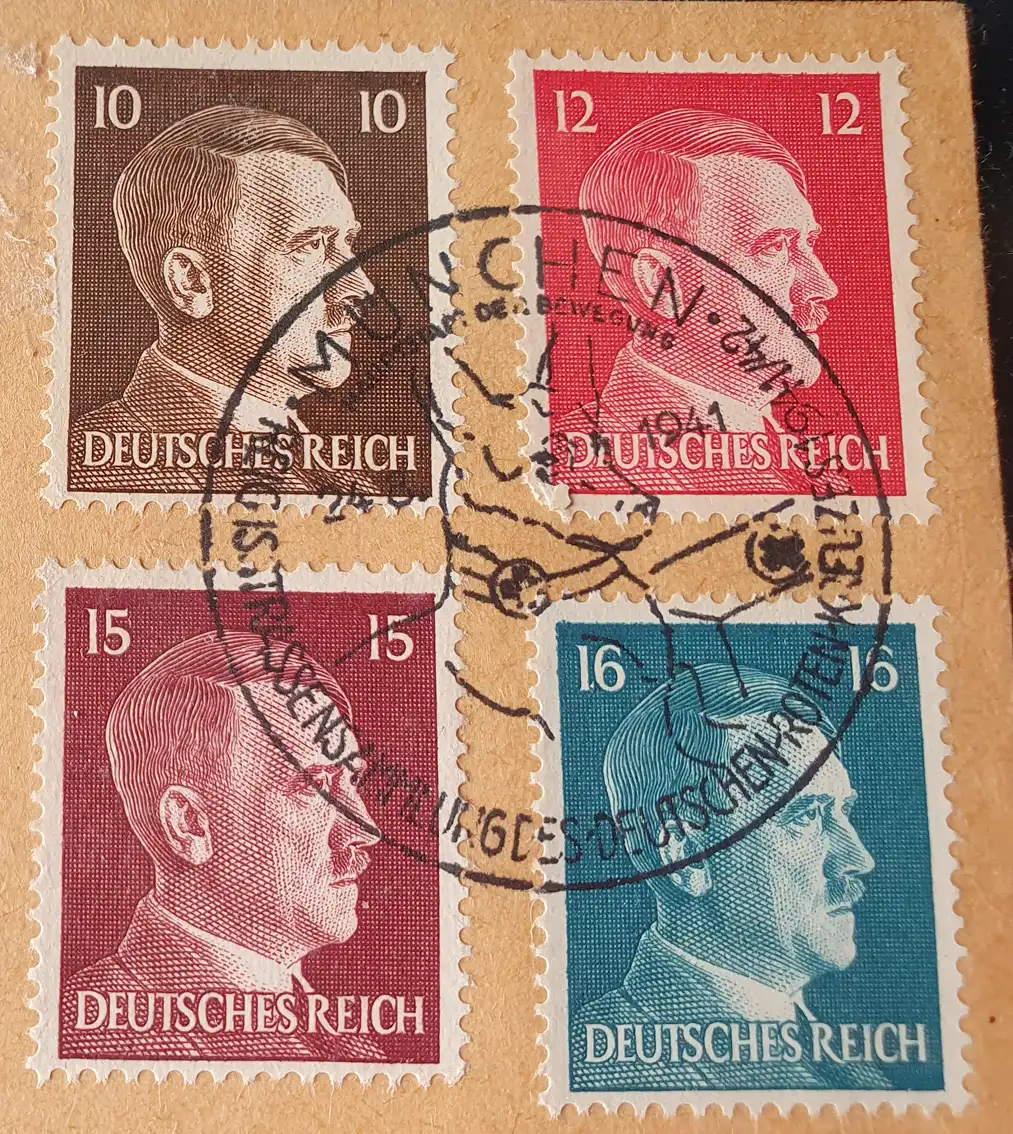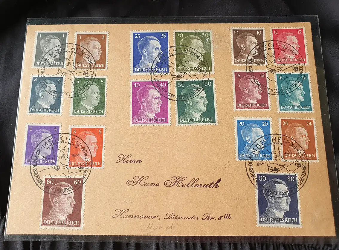 Briefumschlag / Ganzsache mit 18 verschiedenen Hitler Marken. Von 1 Pfennig bis 80 Pfennig.