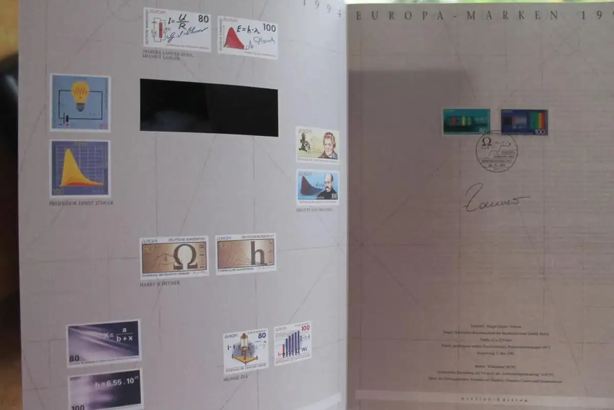 Aufwändig gestalter und hergestellter Bogen aus Kunstdruckkarton mit Leinenstruktur im Format etwas größer als DIN A4. Auf dem Doppelbogen Marke oder Block mit Ersttagsstempel, sowie die nicht angenommenen Konkurenzentwürfe. Unter der Marke befindet sich die Unterschrift (Faksimile) der Entwerfes. Diese Blätter wurden jewils nur in einer sehr kleinen Auflage von der Deutsche Post an Abonnenten abgegeben und sind somit viel seltener als ähnliche Produkte, wie die Ersttags-Sammelblätter oder privat hergestellten Künstler-Ersttagsblätter. Auf Seite 4 bzw. 6 (nicht abgebildet) eine ausführliche Beschreibung zum Anlaß.