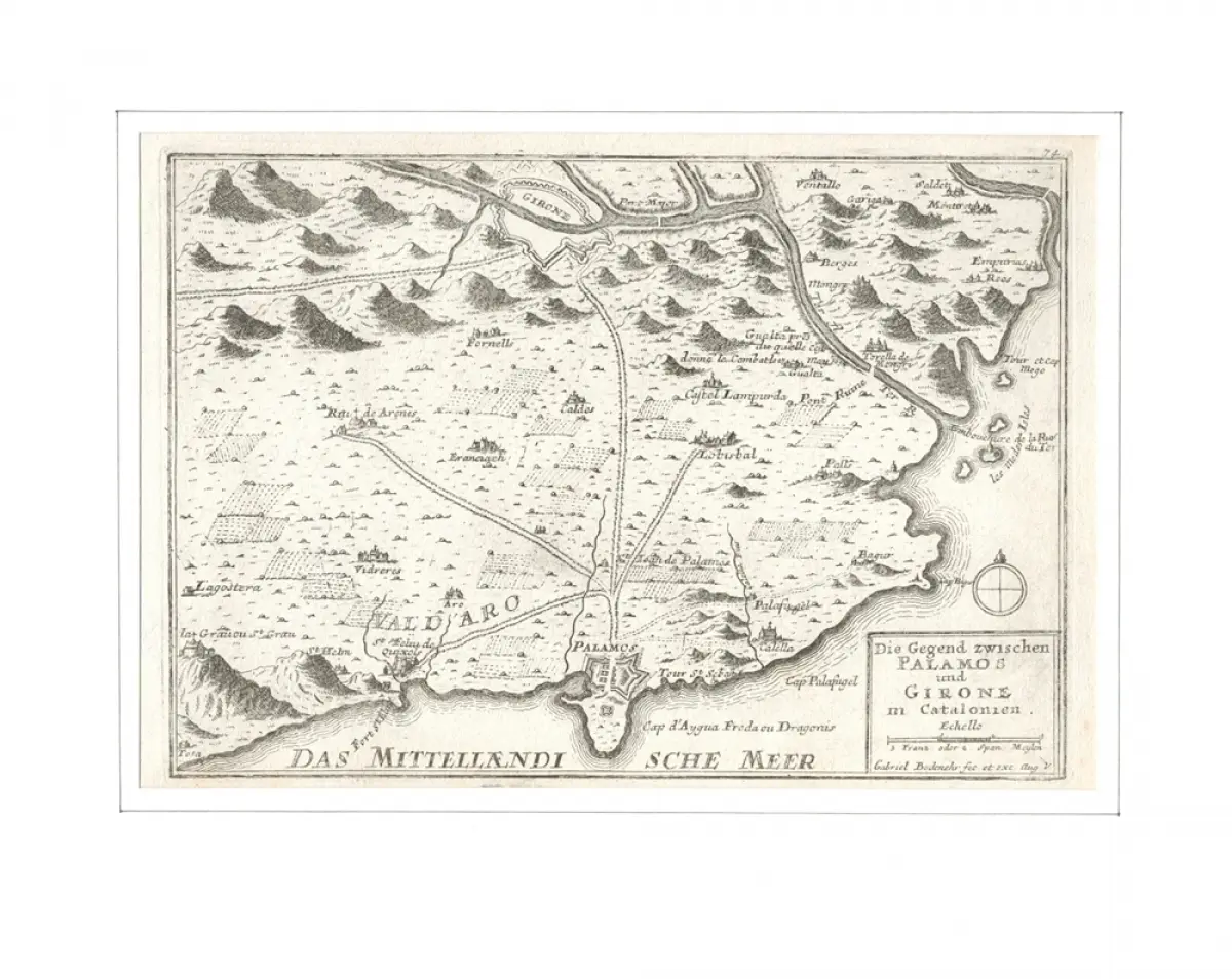 Die Gegend zwischen Palamos und Girone in Catalonien. Befestigungsplan aus der Vogelschau. Original-Kupferstich, Bodenehr, Gabriel