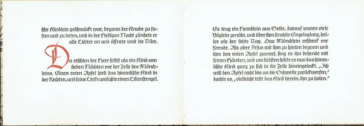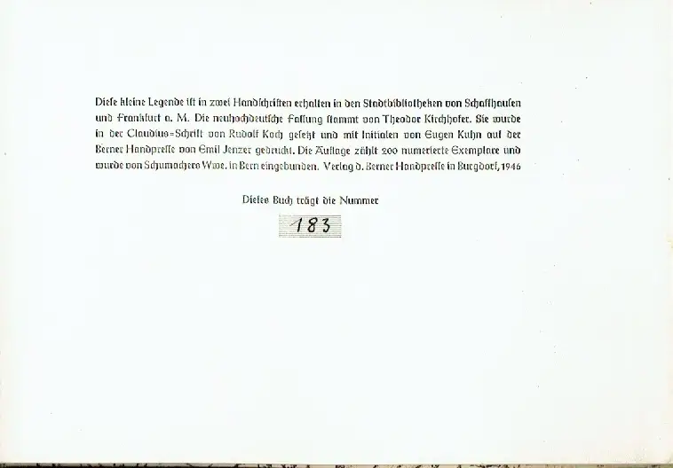 guter bis sehr guter Zustand, geringe Gebrauchs- und Alterungsspuren: Rücken etwas vergilbt / gebräunt - kleine private Widmung im Vorsatz, Diese kleine Legende ist in zwei Handschriften erhalten in den Stadtbibliotheken von Schaffhausen und Frankfurt a. M. Die neuhochdeutsche Fassung stammt von Theodor Kirchhofer. Sie wurde in der Claudius-Schrift von Rudolf Koch gesetzt und mit Initialen von Eugen Kuhn auf der Berner Handpresse von Emil Jenzer gedruckt. Die Auflage zählt 200 numerierte Exemplare und wurde von Schumachers Wwe. in Bern eingebunden. Verlag d. Berner Handpresse in Burgdorf, 1946 dieses trägt die Nr. 183, Pappband, ca. 20 x 13,5, 11 Seiten