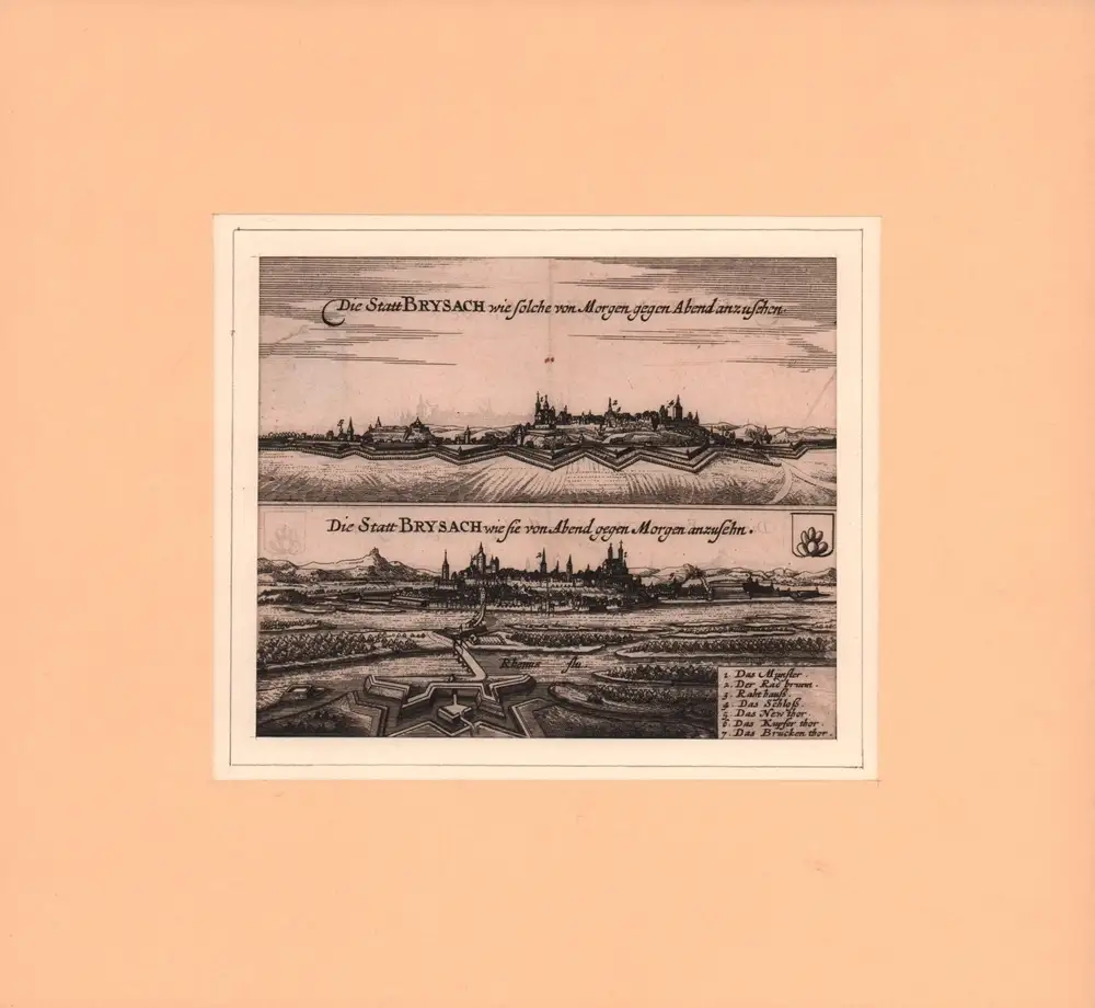 Die Statt Brysach wie solche von Morgen gegen Abend anzusehen. Die Statt Brysach wie sie von Abend gegen Morgen anzusehn (1. Das Münster. 2. Der Rad brunn. 3. Das Rahthauß. 4. Das Schloß. 5. Das New thor. 6. Das Kupfer thor. 7. Das Brucken thor). 2 Ansich