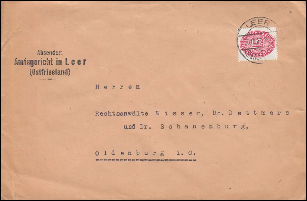 Service marque 124 paille chapeau 15 pf. EF lettre tribunal de l'Office Leer (OSTFRIESL.) 30.12.31