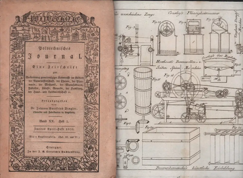 Darin u.a.: Verbesserung im Baue der Stühle zum Weben verschiedener Zeuge aus Wolle, Worstedt, Baumwolle, Flachs. Seide, und anderen Materialien, was die die Maschinerie als den Gebrauch derselben betrifft; Verbesserungen an gewissen Theilen der Baumwollen- und Seide-Spinnmaschinen; Beschreibung einer Schöpf-Maschine; Immerwährende Pumpen; Verbesserungen an Räderfuhrwerken; Bemerkung über ein Mittel zur Begünstigung des Zuges der an Wagen angepannten Pferde. - Weitere Artikel zu den Themen: Dampfmaschine, Windmühle, Wasserrad, hydraulisches Rad. - Tafel 1: Webstühle, Flüssigkeitsmesser, Windmühle, Kunsteisherstellung. - Tafel 2: u.a. Eisenbahn, Dampfmaschine, Handsägemühle, Wasserrad, Pflasterstreicher. - Angestaubt, vereinzelt leicht stockfleckig. - Unbeschnittenes Exemplar