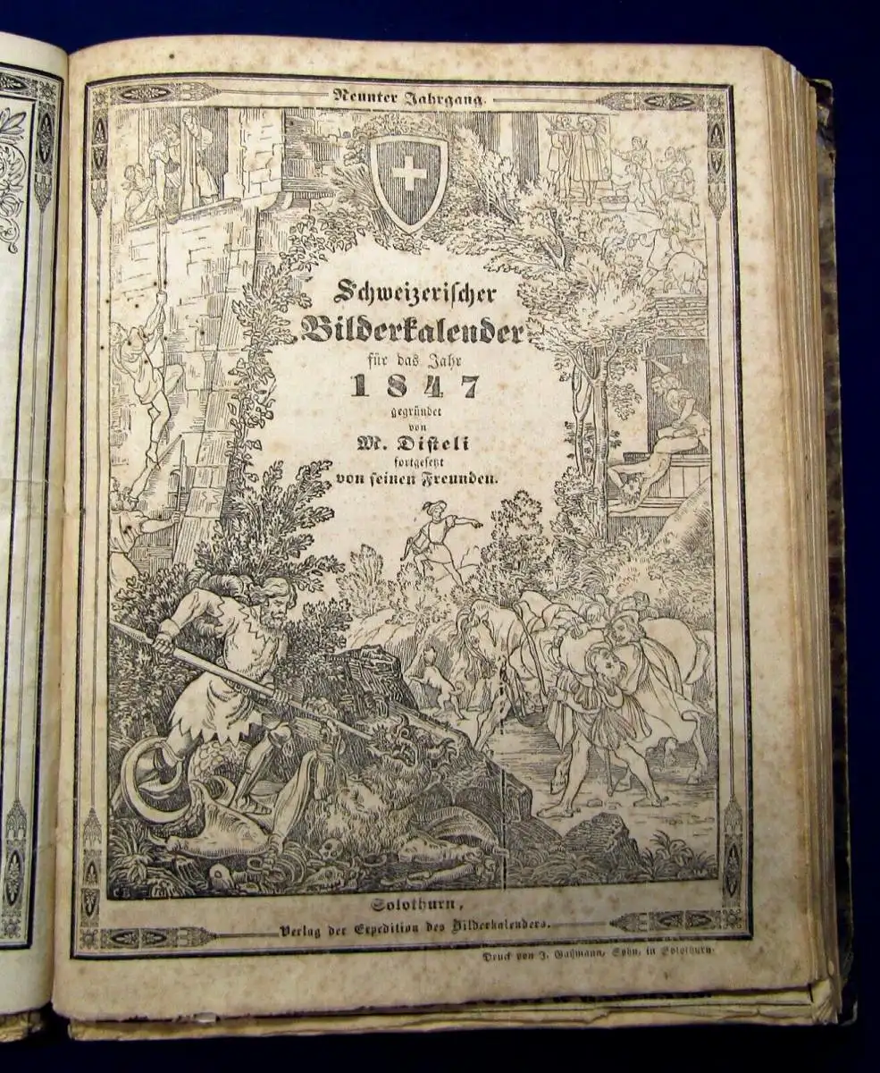 4x Schweizerischer Bilderkalender Jahrgänge 1844, 1845, 1846, 1847