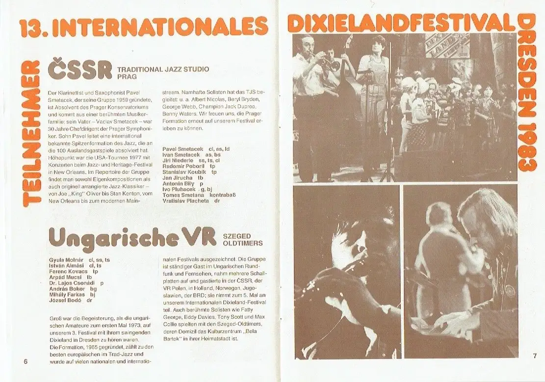 sehr guter Zustand, geringe Gebrauchs- und Alterungsspuren, wer, wann, wo, welche Veranstaltungen Beilage: die erstmalig teilnehmende Six Sounds Jazzband aus der BRD wird auf einer A5-Seite beschrieben, Softcover, ca. 14 x 20, 16 Seiten mit 11 Bildern