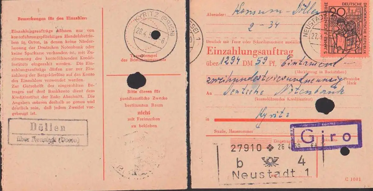 Döllen über Neustadt (Orla) Einzahlungsauftrag an Deutsche Notenbank Kyritz, 20 Pfg. "5 Jahre Jugendweihe" 27.4.59