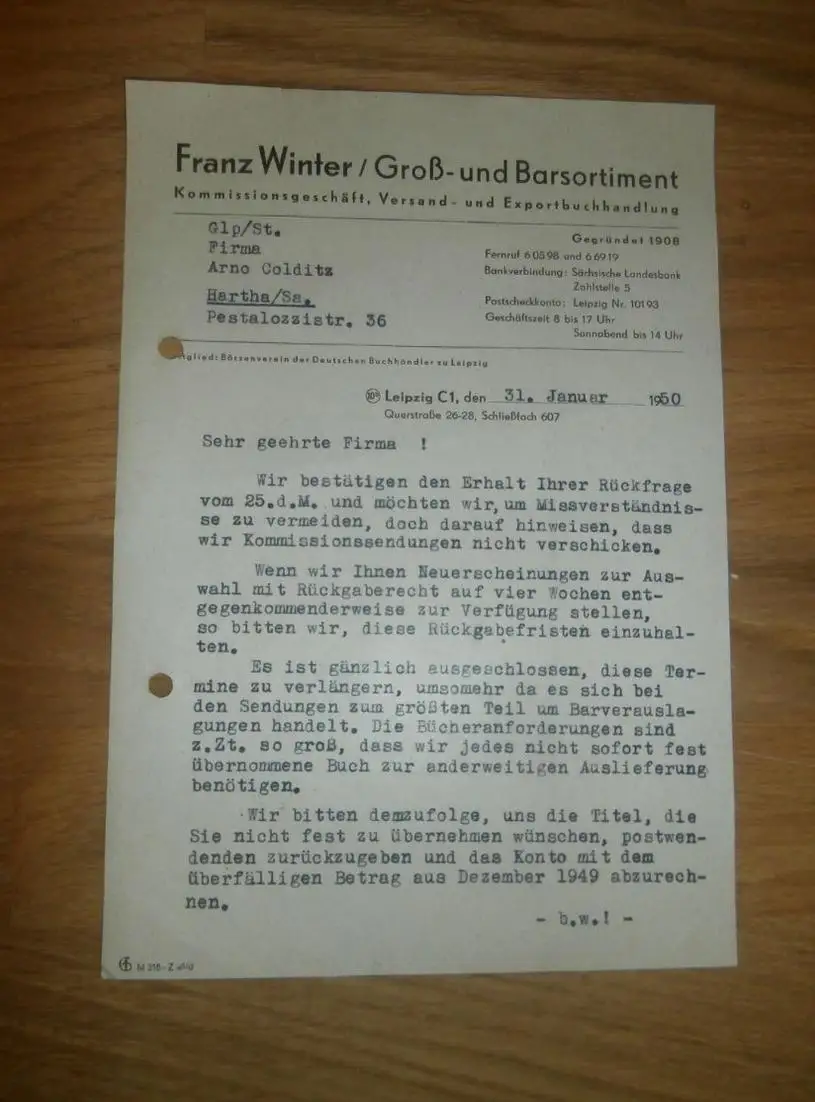 Dokument - Franz Winter in Leipzig , 1950 , Querstraße , Kommissionsgeschäft , Arno Colditz in Hartha i. Sachsen !!!
